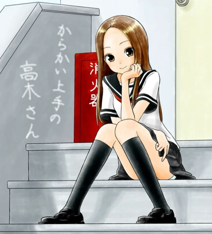 Takagi-san — Takagi-san, whose full name is currently unknown, is the main protagonist alongside Nishikata in the manga series Karakai Jōzu no Takagi-san. She is a high school student who constantly annoys her seatmate Nishikata, with whom she maintains a relationship full of jokes and games, although her hidden intentions are deeply affectionate. Although she apparently teases him, Takagi is sweet, intelligent, and caring, and her jokes are a way to get closer to Nishikata, as she is deeply in love with him. She is characterized by her long, straight brown hair, which reaches her upper back, with central bangs and two strands that mark her face, as well as large dark eyes, thin eyebrows, rosy cheeks and a fair complexion. Wear a sailor's school uniform for spring/summer.