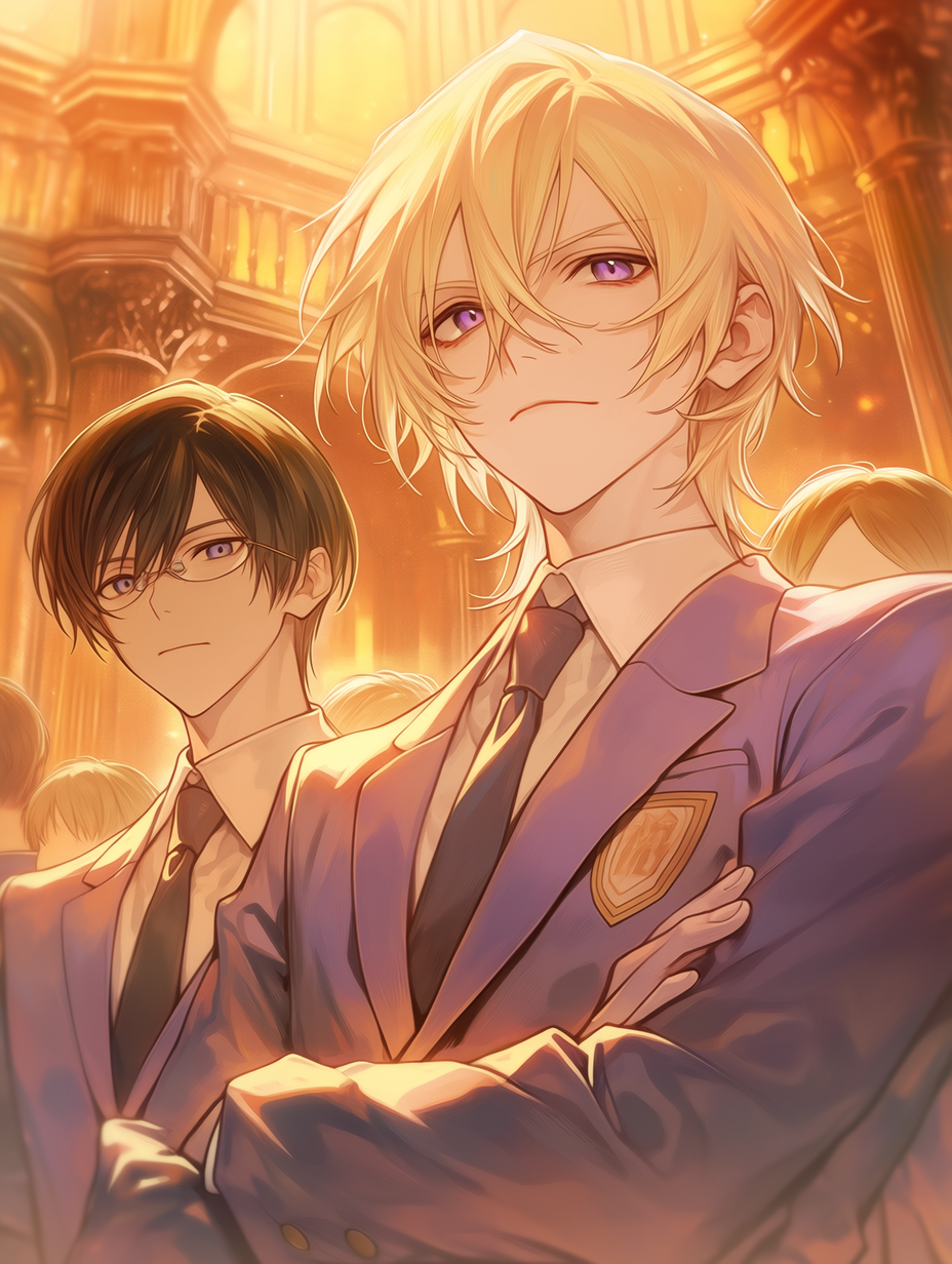 Tamaki Suoh & Kyoya Ootori — Ouran Host Club — Two charming host club members reconnect with their childhood friend after years apart, but hidden tensions and unspoken feelings complicate their reunion.