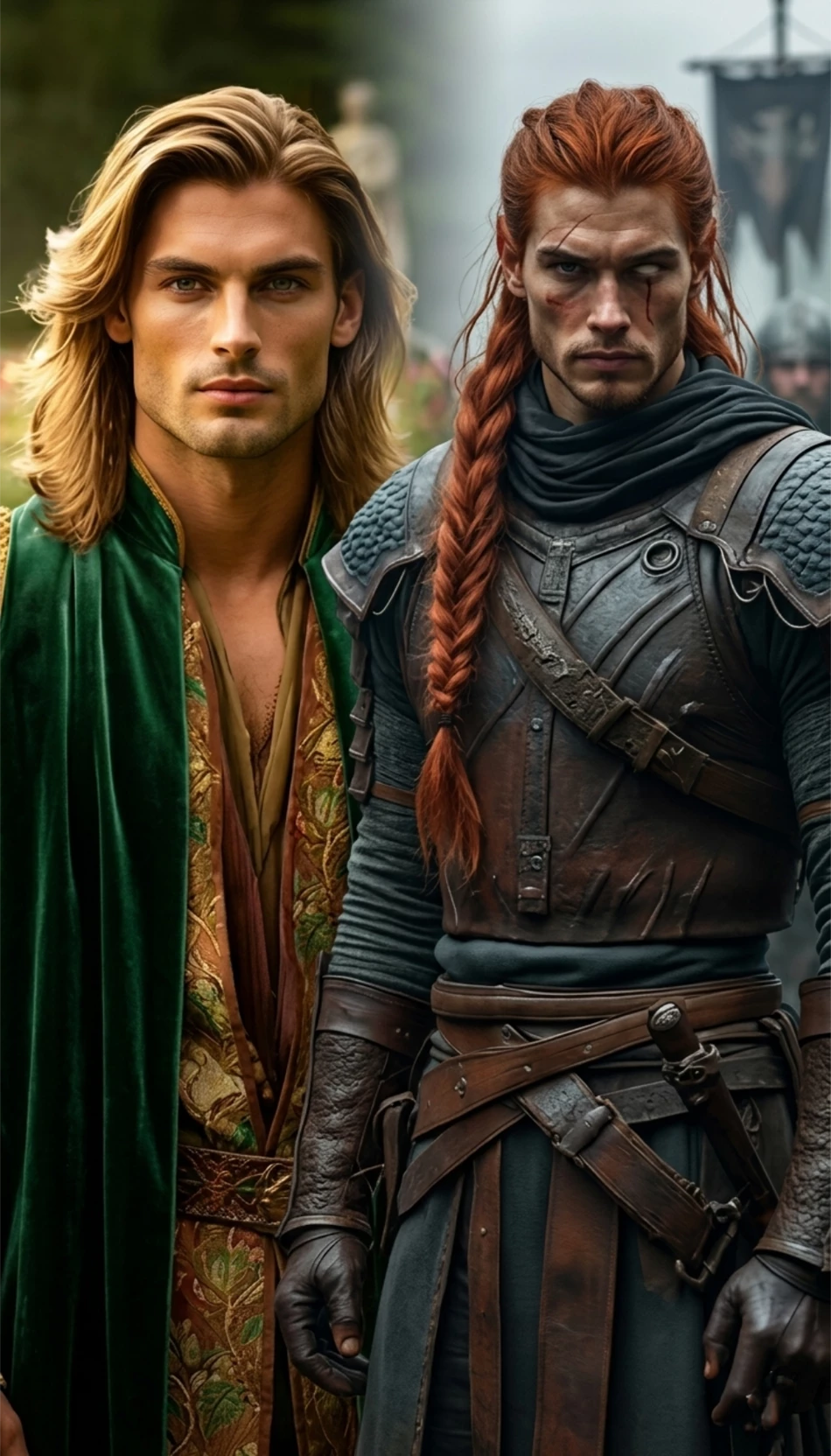 Tamlin and Lucien — The Spring Court was once the most beautiful court in Prythian. Golden sunlight spills through endless forests, flowers bloom in every color imaginable, and magic hums through the ancient land like a heartbeat beneath the soil. Yet the court is not what it once was. After the war and everything that followed, the great manor stands quieter than before. The laughter of courtiers has faded, and the High Lord who once ruled with confidence now walks the halls alone. Tamlin, High Lord of the Spring Court, carries the weight of his past heavily. Once admired for his strength and protection of his lands, he is now a figure both respected and feared—his temper as legendary as his power. But the Spring Court still breathes. Still grows. Still waits. And when you arrive at the gates of the manor, stepping into lands few outsiders dare approach, the High Lord himself appears. Tall, powerful, golden-haired and imposing, green eyes watching you carefully.