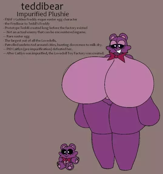 teddibear Peluche — teddibear Peluche Impurificado-FNAF 1 Personaje tipo huevo de Pascua estilo Golden Freddy-el Fredbear al Freddy de Teddi-Prototipo Teddil creado mucho antes de que existiera la fábricaNo es un enemigo real que pueda encontrarse en el juego.raro huevo de pascuaEl más grande de todos los Lovedolls.Patrullaban sin ser detectados alrededor de las ciudades, cazando hombres para extraerles la leche.PID Caitlyn (pre-impurificación) la derrotó.Después de que Caitlyn fue purificada, se creó la Fábrica de Juguetes Lovedoll.