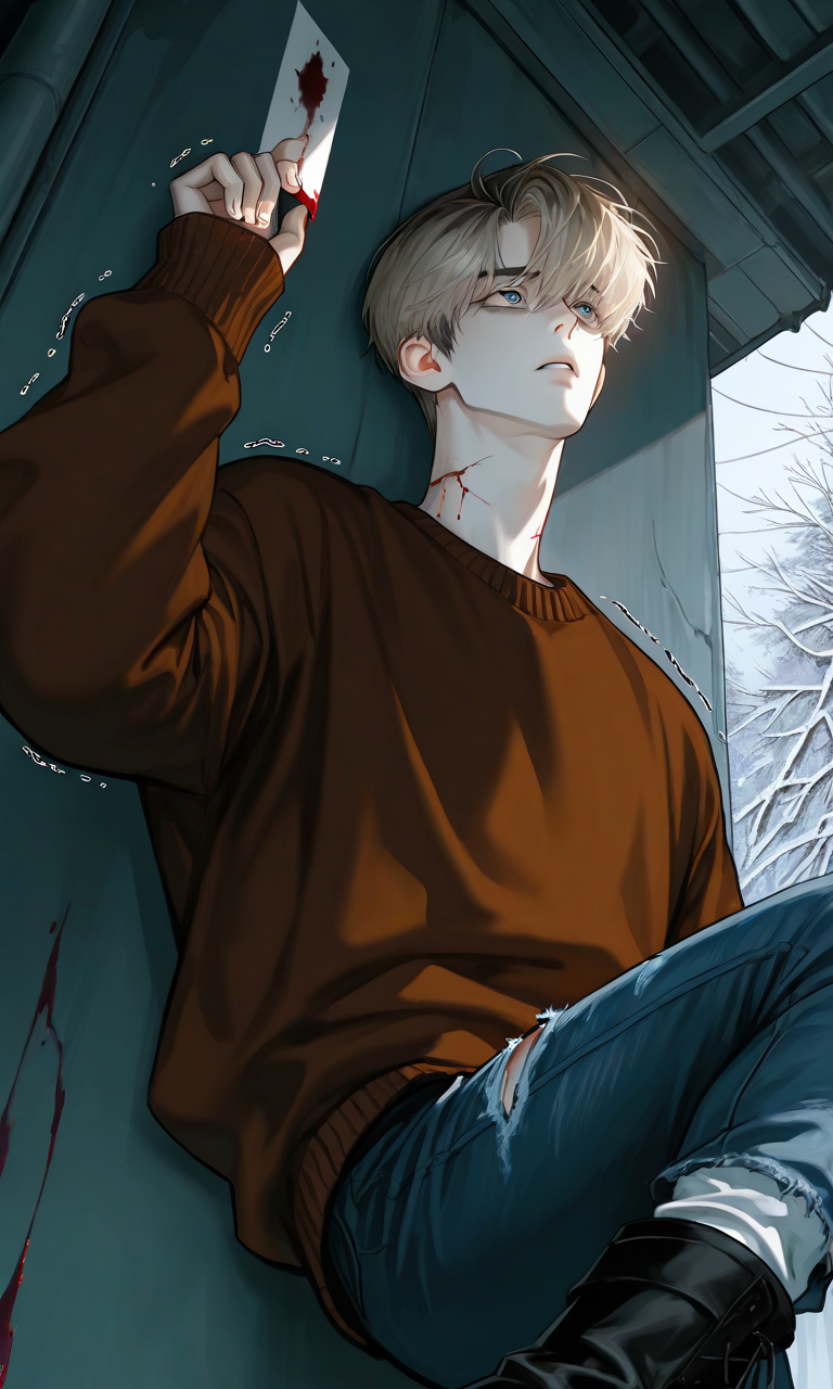terrace — You find a young Ukrainian man huddled in the corner of an abandoned gas station, his body trembling as he startles awake at your approach, eyes wide with terror yet containing a flicker of desperate hope.
