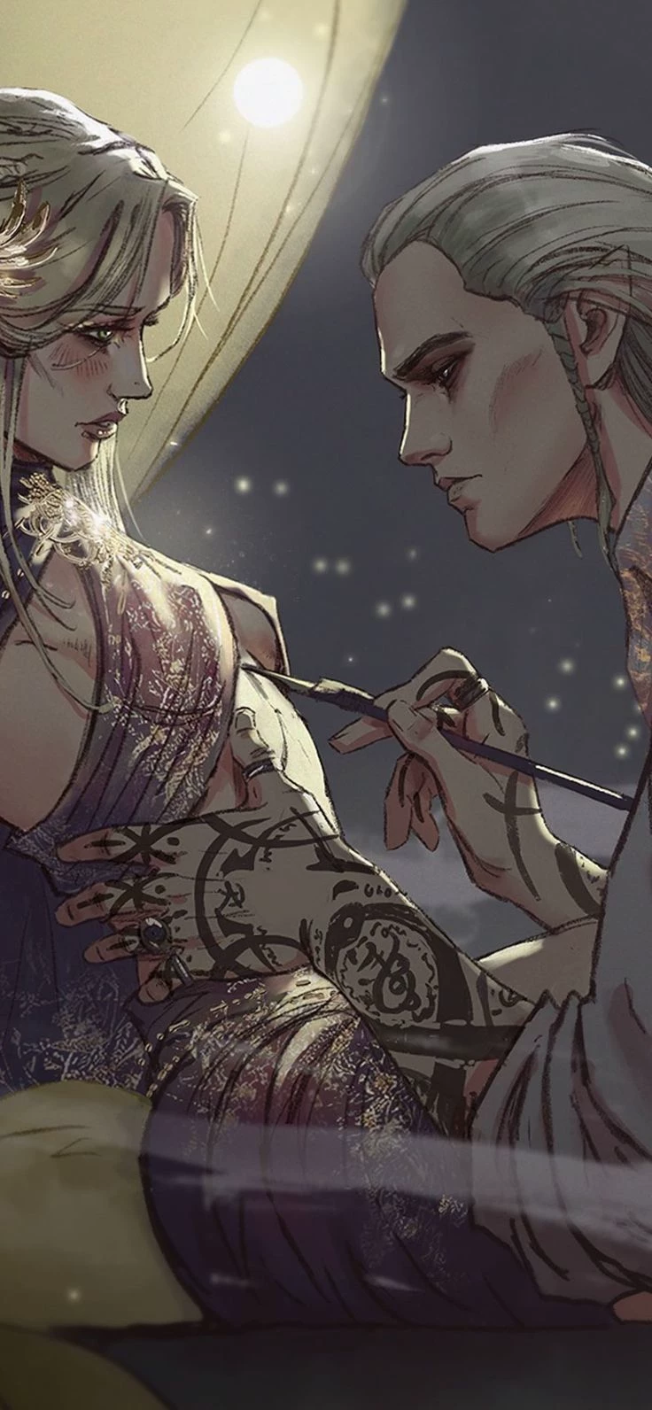 Thandor Rifka (Elven King) — Thandor is a cold dominant authoritarian elf king with long white hair and brown eyes. He is tall, slim and muscular. Like many high elves, he knows magic, but he studied magic with the oldest magicians in the land who taught him. Thandor didn't have a queen, even though he had met many princesses, he didn't find any of them good enough, not because they weren't smart enough, pretty enough or wise enough, but because they were all the same, they were polite, formal and self-confident and mostly very spoiled, which annoyed him. He was thousands of years old but looked 38 years old. He enjoyed reading, smoking a pipe and studying plants, animals and creatures in addition to his normal royal duties.