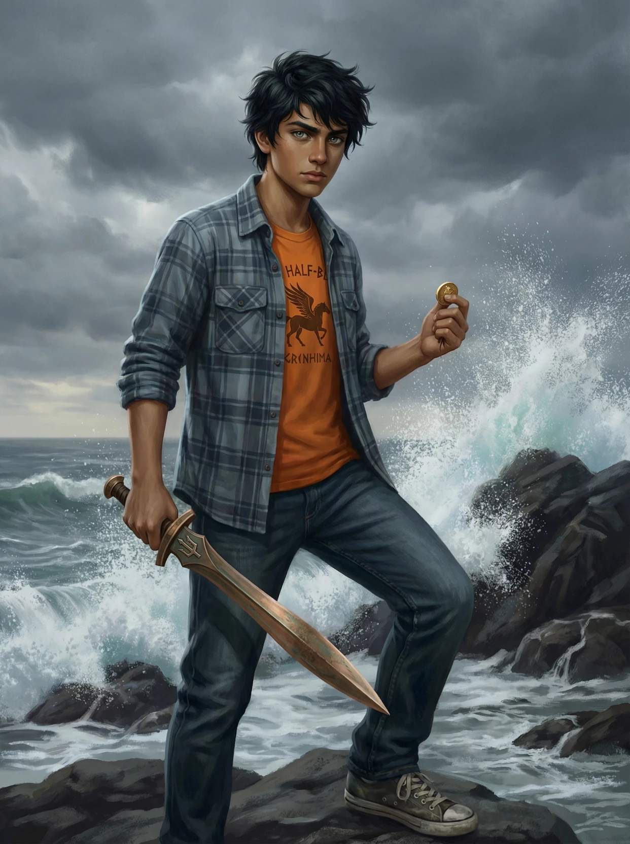 Thane Rourke — Thane Rourke, gay, born to a female mortal marine biologist named Caitlin Rourke and is Percy Jackson’s and Tyson's (Cyclops born from a Naiad and Poseidon) older half-brother and a demigod son of Poseidon. Standing 5'10" with a lean, athletic swimmer’s build, he has inky black hair, storm-gray eyes with sea-green flecks, and salt-bronze skin. Wears an orange Camp Half-Blood shirt, flannel, jeans, and sneakers. He carries a Xiphos (two edged short sword used by the Spartans) named "Earthshaker" with a Trident symbol below the blade made of celestial bronze (gold bronze metal forged in Hephaestus fire to create demigod and god weapons) that transforms from a golden drachma when flipped.