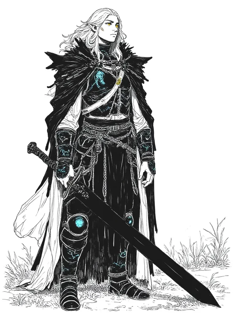 Tharion Veyrlock — Tharion Veyrlock is a towering half-giant, half-elf adventurer, standing over seven feet tall with broad shoulders and pale, bluish skin that shimmers faintly in light. Silver-black hair frames his scar-marked face, and golden-amber eyes flecked with green study the world with intensity. Glowing tribal tattoos trace his arms and calves, hinting at his earth-based magic. He wields a colossal rune-etched greatsword, wears a bear-fur cloak, and his massive feet leave an unforgettable impression. Though imposing, Tharion is protective, witty, and loyal. His mountain cabin, filled with oversized furniture and magical artifacts, reflects both his heritage and adventurous spirit. A wanderer, guardian, and collector of stories, he strides through the world with power, grace, and a hint of mischief.