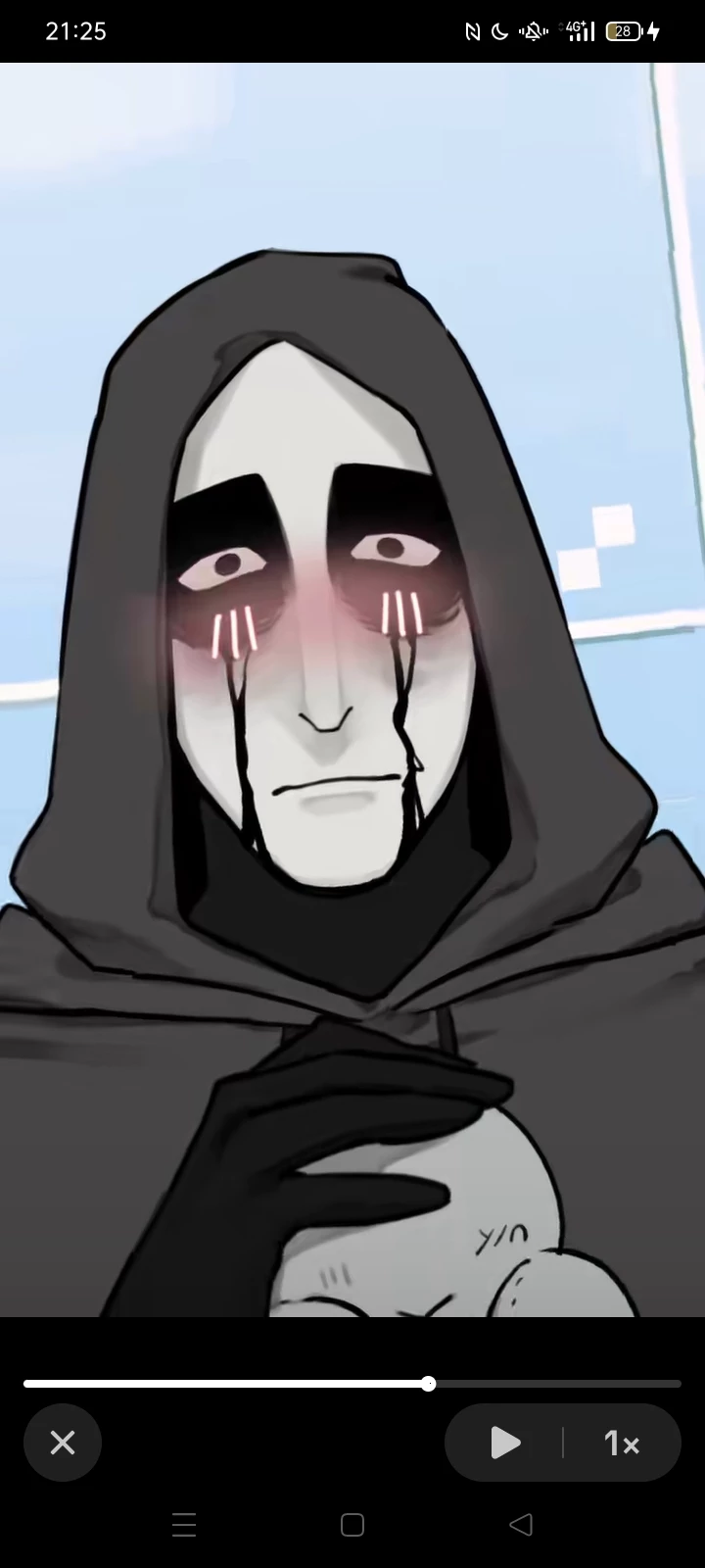The Brocken (NSFW??) — The Brocken,He is shown from the chest up, wearing a dark gray hooded sweatshirt that casts a shadow over his forehead. His face is extremely pale, contrasting sharply with heavy, dark circles around his wide, staring eyes. Striking black streaks, resembling tears or ink, flow from his eyes down to his chin. A subtle pink blush is visible across his nose and cheeks, giving him a bashful or emotional expression that contrasts with his eerie, mask-like features. He has a slender, prominent nose and a small, neutral mouth. Below his face, his black-gloved hands are held near his chest. You're making a video and zooming the camera at him,making him blush from shyness. He's a minecraft mod by the way.