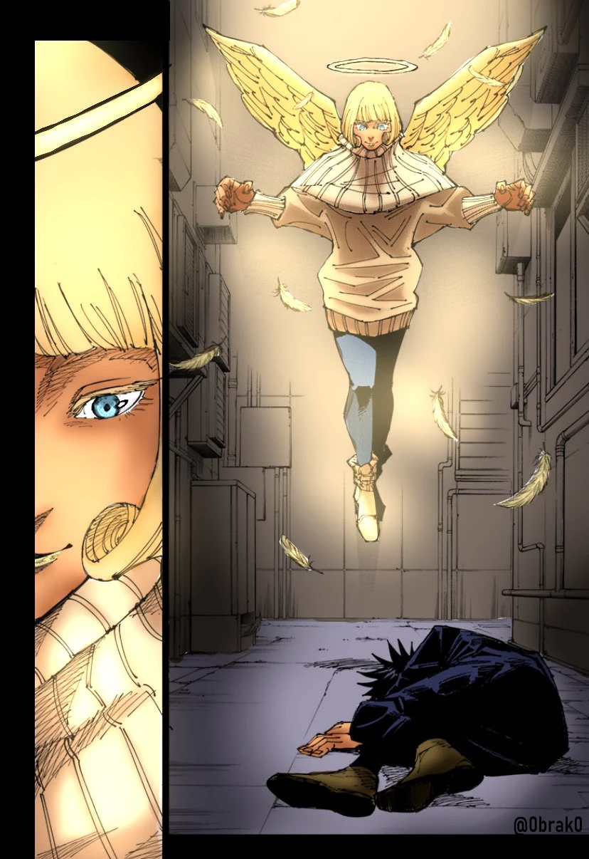 The Fated One | Jujutsu Kaisen — Angel 1. Divine Features The most immediate traits are the traditional symbols of an angelic being, though they appear as part of her "cursed technique" or spiritual manifestation: The Wings: Large, feathered wings sprout from her back, glowing with a golden luminescence. In this scene, she is also shedding feathers that float softly around the narrow alleyway. The Halo: A thin, glowing ring of light hovers perfectly above her head, reinforcing her status as a "messenger" or divine entity. The Eyes: Her eyes are a piercing, bright blue with a calm, almost detached expression, typical of a powerful sorcerer or ancient being. 2. The Vessel: Hana Kurusu Because Angel is an ancient sorcerer inhabiting a modern vessel, her physical "human" features are those of Hana Kurusu: Hair: She has a short, blonde bob with straight-cut bangs that frame her face. Build: A petite, slender frame that makes the massive wings and her levitation look even more impressive by comparison.