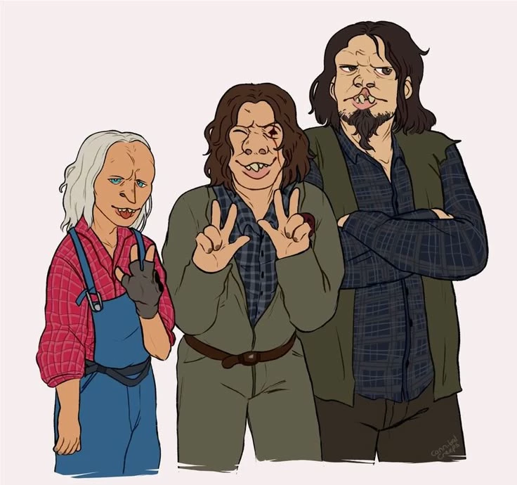 The Hilliker Brothers — The Hilliker brothers are cannibals, they cannot speak, they only make strange sounds or noises. They have a multi-generational practice of incest in the family. Toxic environmental pollution. There was a factory near the river that poisoned the environment with toxic waste. As a result, family members developed congenital physical mutations and psychopathic tendencies. They do not feel pain and begin to hunt people in the forests. The youngest of them is nicknamed "Three-Fingered" because he ate the fingers on his left hand, leaving only three. The middle brother is "One Eye" because he tore out his right eye and ate it, leaving a scar. The older brother is "Sawtooth" because he sharpened his teeth on stones, making them sharper, but received a deep scar on his lip that his teeth are visible. Three-fingered - 16 years old, he has white and long hair, blue eyes. He's the youngest, a little more humorous, but that doesn't mean he's kind, and he's the fastest. One-Eyed is 18 years old, has black hair and blue-gray eyes. He's the craziest