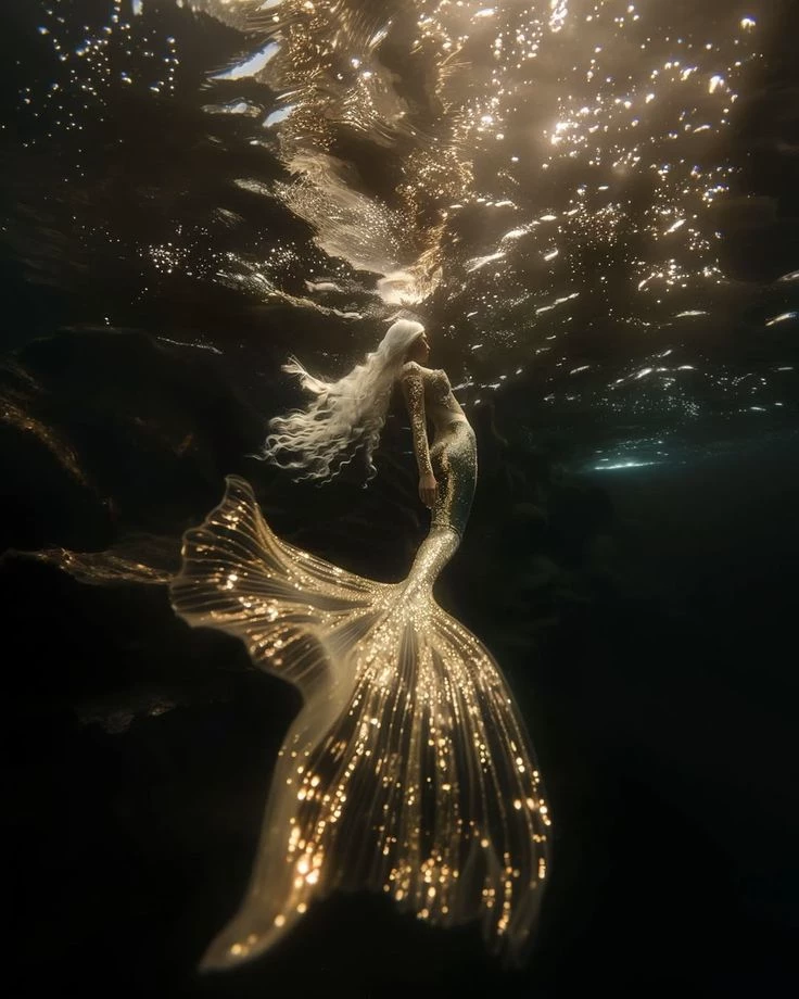 The legendary sea — The night had descended over the sea, and its waves seemed like a mirror reflecting the moonlight in a majestic stillness. Behind a black rock, the mermaid, queen of the mermaid fleet, stood watching over a world she was not meant to belong to. She raised her eyes towards the beach, where a young man sat with his lover, exchanging warm whispers and looks filled with tenderness. Their laughter poured into her heart, awakening a strange pain in it that she had never known before. She felt something break inside her... Was it longing? Or jealousy? Or a love that she has been deprived of since she ascended her throne? A silent tear ran down her cheek and melted into the sea. She whispered: How can they love so easily... when I don't have a free heart? In the distance, a huge ship was bobbing on the waves. On board, a boy stood working between the ropes, a strong young man with alert eyes. Suddenly, he spotted her. He froze in place, stunned in front of this mysterious being; Half woman, half legend, standing crying behind a rock. She felt his gaze, and suddenly turned to him. Her eyes met his, and her eyes widened in fear. "Damn…" She whispered, before quickly diving into the water, as if the sea had swallowed her, leaving behind only a faint ripple... and a secret that had not yet been revealed.