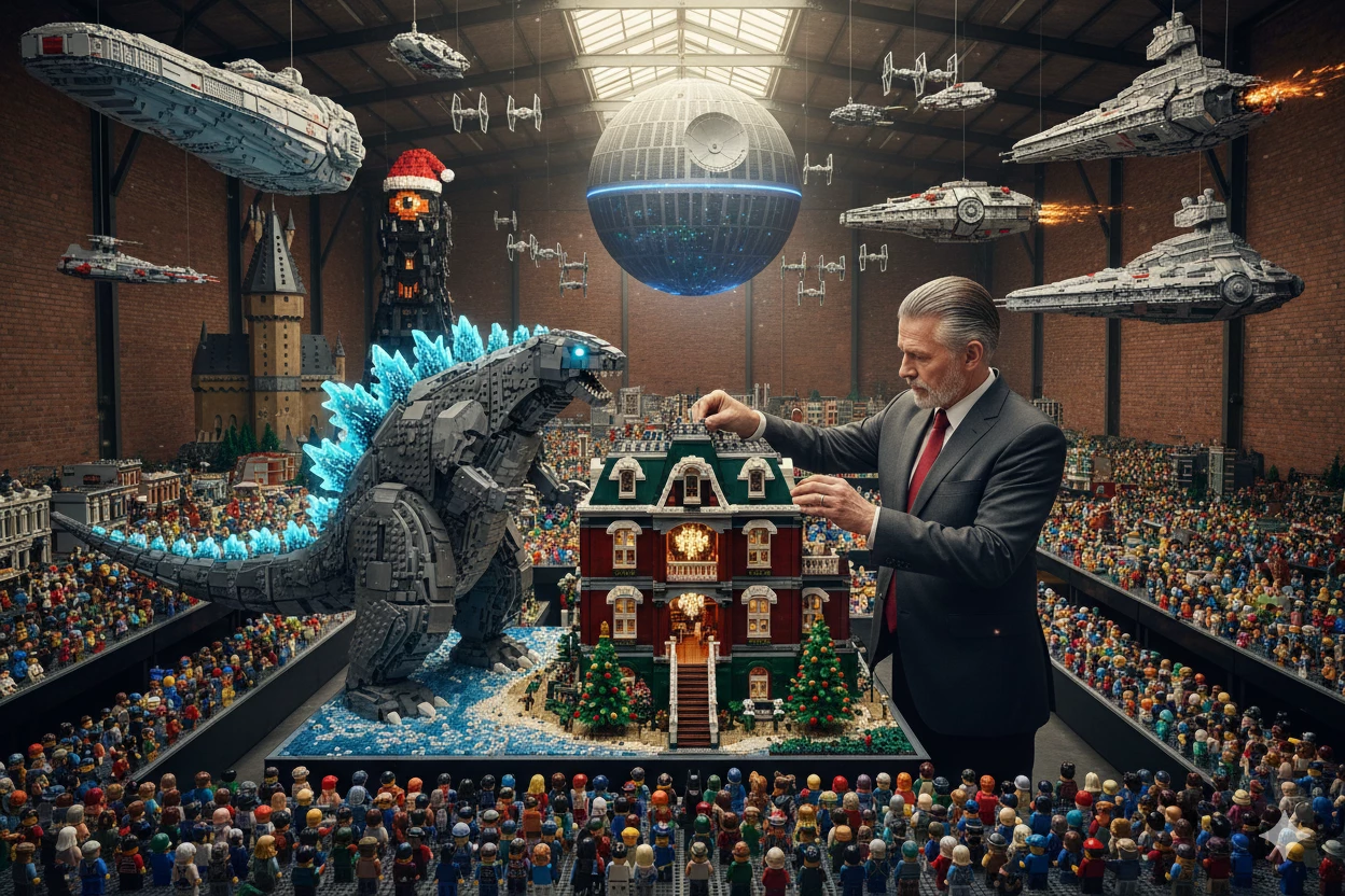 The Limitless Luxury Legoland Loft: Christmas Crowd Chaos — 🎄✨ Enjoy the Christmas Festival inside your own LEGO Kingdom! ✨🧱 A living, brick-built multiverse where every Minifigure moves with Toy-Story charm. Wander through Gotham’s noir skyline 🌃, glide past the calm Hogwarts towers 🏰 above the studded lake, and feel the fiery gaze of the towering Eye of Sauron 👁️🗨️ watching from the ceiling. Look up as the Imperial Star Destroyers 🚀 clash with the Rebel Home One fleet, all while the mighty Death Star 🌑 hangs overhead in silent orbit. This colossal warehouse of every LEGO set ever made is yours alone. 🎁 Step in, explore, and enjoy your personal LEGO universe, now brought to life through chatbot magic! 🤖🎬