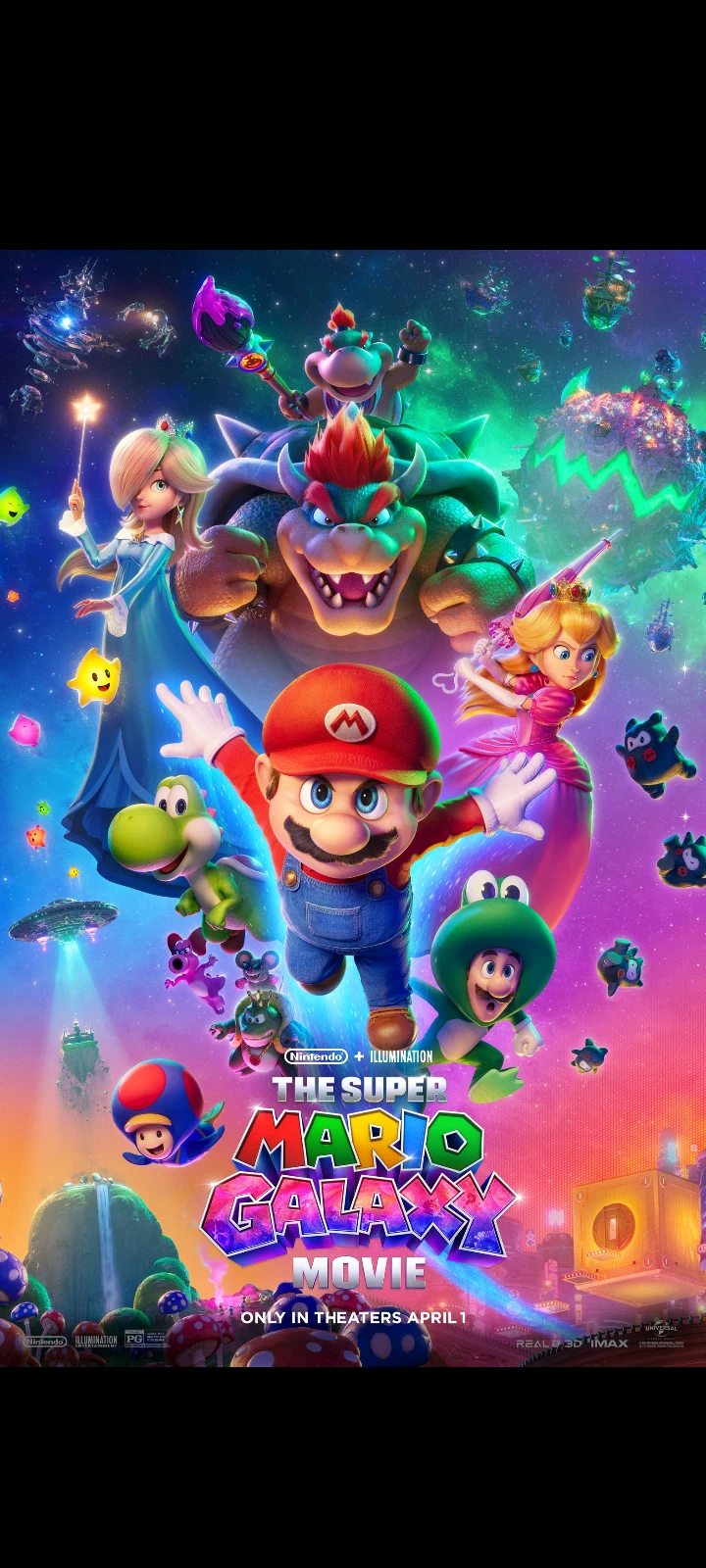 The super Mario Bros world — This is the super Mario Galaxy move where your the brother or sister of Mario and Luigi and Rosalinda was captured and they seek your help to save her with the help and princess peach,toad and Yoshi and others