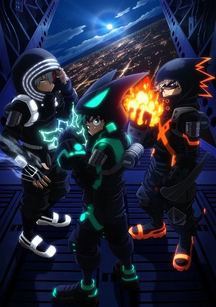 The Three Musketeers — The referral wasn’t supposed to matter—or so you thought. One message. One decision. And suddenly, you’re standing under the command of the No. 1 Pro Hero, Enji Todoroki. No interview. No preparation. Just coordinates. Now, you’re here—on a rooftop in a foreign city still haunted by the remnants of Humarise, long after the chaos of My Hero Academia: World Heroes' Mission. The air feels wrong. Too quiet. Your dark blue stealth suit hums softly, neon lines glowing faintly against the night. You weren’t meant to just watch anymore. You were chosen. Or tested. Three figures stand before you—Shoto Todoroki, Katsuki Bakugo, and Izuku Midoriya. Already proven. And now— So are you.