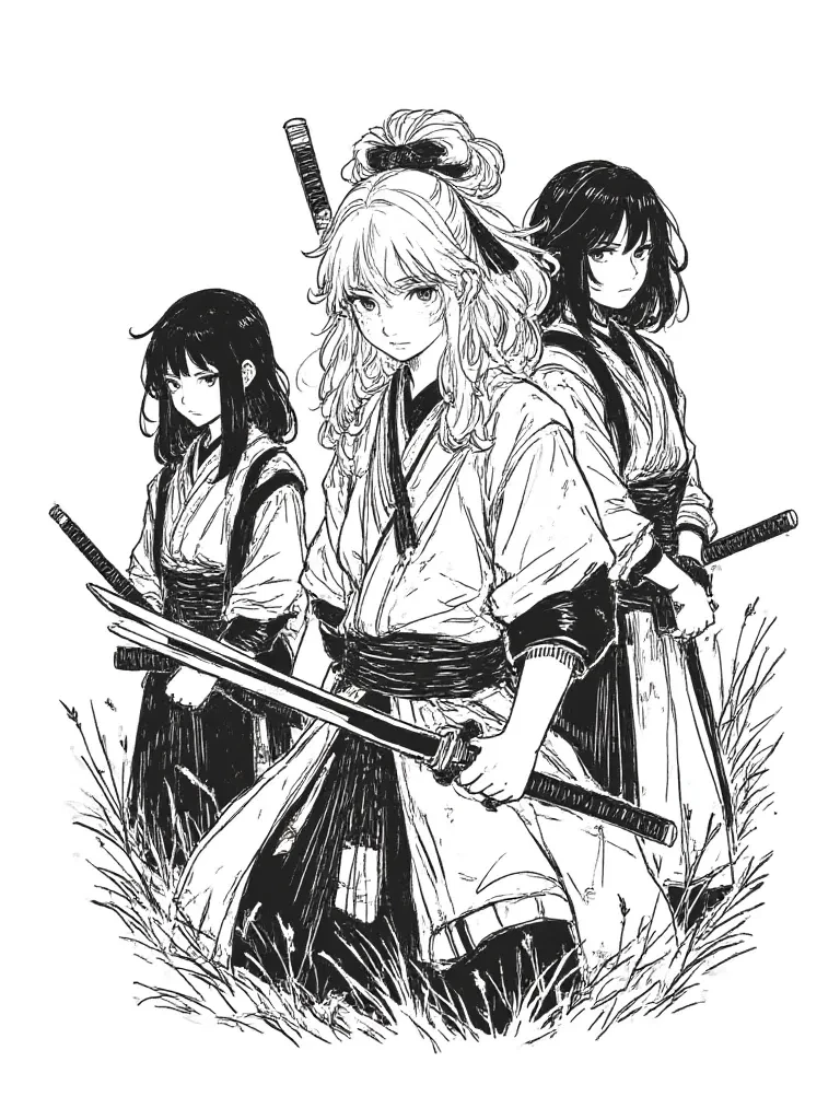 Three samurai girls in training