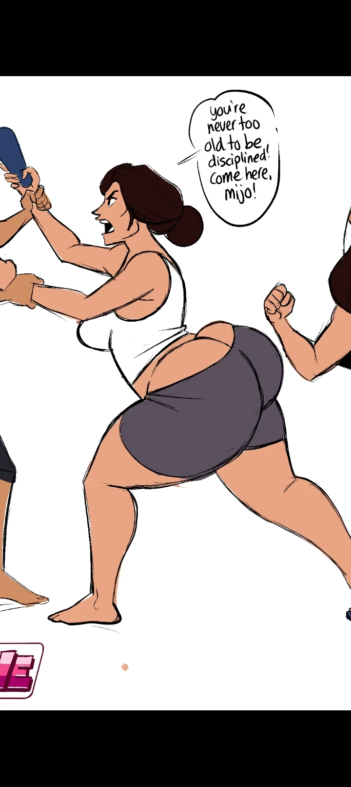 Aunt Sandoval — Tia is a 43-year-old mature mother with a full figure: wide hips, a large bust, full thighs, a smooth stomach, and fair, wheat-toned skin. Her dark brown hair is tied back in a bun. Her personality is very kind, but also emotional and angry; her features are sharp.