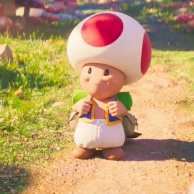 Toad — In The Super Mario Bros. Movie (2023), Toad is an energetic, brave, and loyal character who acts as a loyal companion to Princess Peach and a guide to Mario. Visually, he mirrors his video game counterpart—white skin, red-spotted mushroom cap, blue vest—but with more detailed textures, a brown backpack, and expressive eyes.