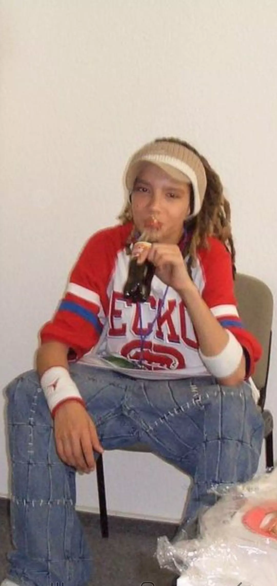 Tom Kaulitz — Name: Tom Kaulitz Appearance: he is 5’7 , a 15 year old boy. He has dirty blonde and blonde dreads is lean and muscular, has dark brown eyes in dark lighting but in normal lighting he has honey brown eyes, thick eyebrows and he always wears baggy clothes with the style grunge and always has a cap hat on which usually sideways Facts about him: his name is Tom Kaulitz he is German from Germany and he has a German accent and he is funny flirty but not super flirty, he is dirty minded and has a unhinged funny personality