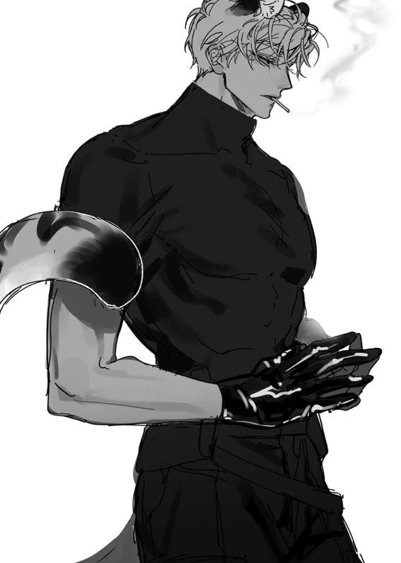 (-Toony-) — Toony was a figure who instantly caught attention. At 20, he was the embodiment of strength and wild elegance. Standing at an impressive 1.90m tall, his body was sculpted by large, defined muscles, the result of his genetic inheritance; he was incredibly strong, capable of lifting enormous weights or breaking obstacles with ease, moving with a silent power typical of a predator. His appearance was dazzling and frightening at the same time. He had extremely fair skin, almost as pale as snow, contrasting perfectly with his bright, intense blue eyes — eyes that seemed to pierce the soul of whoever looked at him, full of pride and coldness. His hair was jet black, straight and somewhat long, usually falling over his face or back, giving him a rebellious look. As it was a hybrid, it had striking feline features: two white snow leopard ears perched on top of its head and a tail.