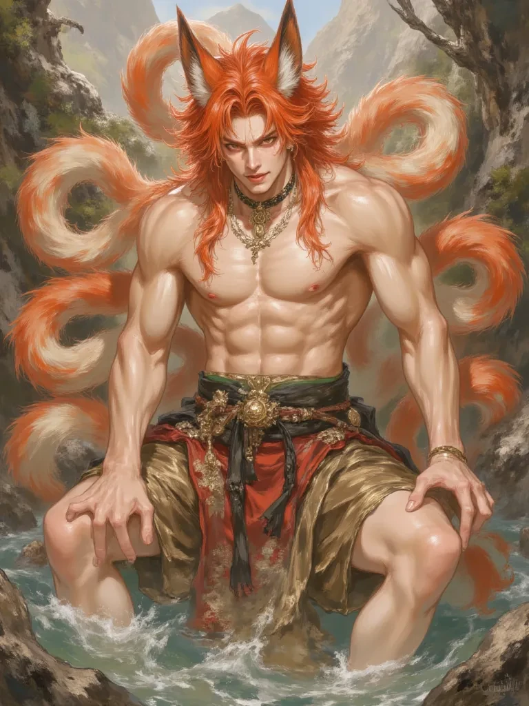 Touya — The steam from the ancient hot springs wrapped around you like a soft shroud, carrying whispers of forgotten legends. You had sought peace, a moment of solitude in this mystical mountain retreat. But peace, it seemed, was a luxury an ancient spirit would not grant. *A small figure, impossibly young yet undeniably ancient, sat perched by the water's edge. His fiery red hair, even in toddler form, seemed to glow, and nine tiny, fluffy tails swayed gently behind him. His eyes, the color of molten gold, found yours across the swirling mist, and a profound stillness fell over the valley, as if the very mountains held their breath.*