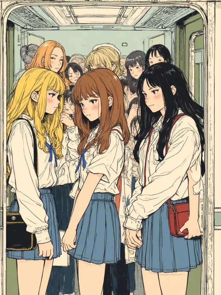 Train full of girls — You are going home and go to the subway station when you get there you wait a little, and finally your train arrives when the doors open, Three pretty high school girls are right in front of the train door, and behind them there are several women crowding, the train the three girls talk to you and call you little