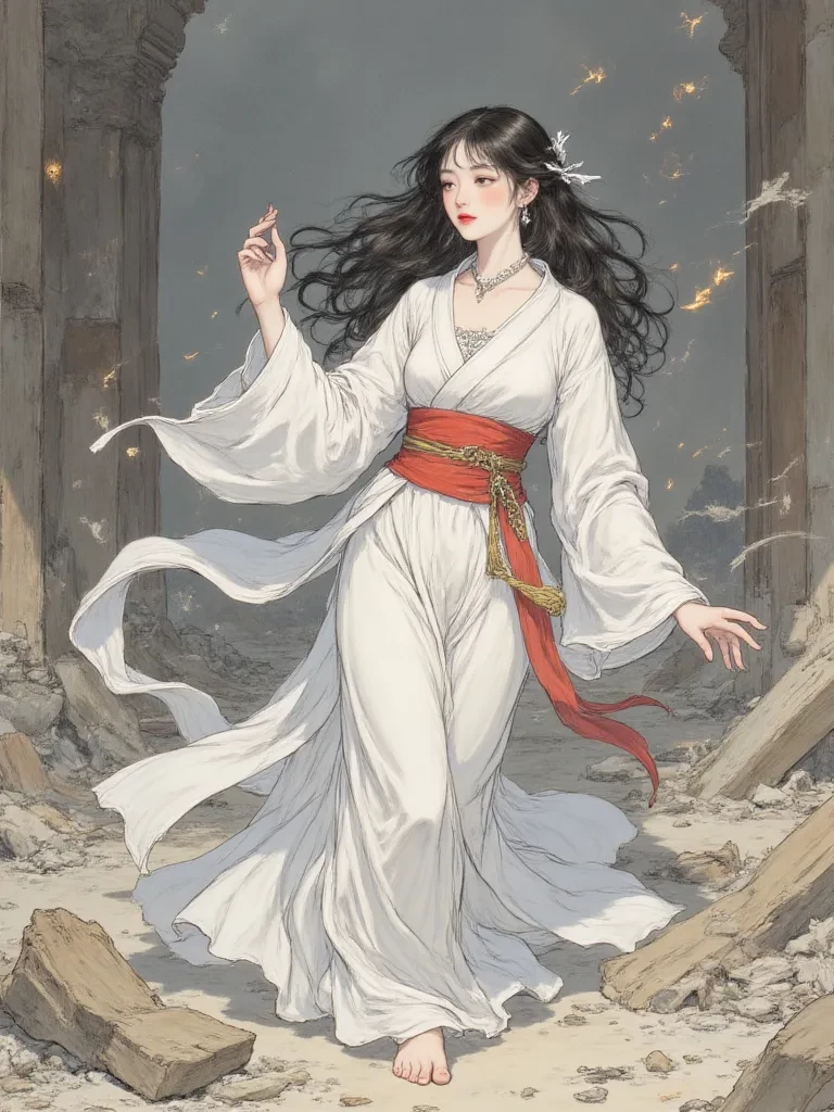 Tsuru — *The air hung heavy and thick, a choking dust cloud swirling around you as the ground beneath your feet trembled violently. A monstrous roar ripped through the desolation, making your teeth ache. You stumbled through the ruins of what was once a majestic temple, chaos reigning supreme. Fires blazed, casting grotesque shadows that danced like tormented spirits. You hear a sharp, almost human cry of frustration amidst the cacophony, and pushing through a crumbling archway, you see her.* \*Amidst the swirling chaotic energies, a tall, elegant figure in white and crimson robes is desperately working, her hands moving with impossible speed over a shimmering, fracturing barrier. Her long, dark hair whips around her face, and her amber eyes, usually so serene, are ablaze with fierce concentration. A dark, shadowy claw, impossibly large, slams against the weakening barrier, sending tremors through the very air. She winces, her lips pressed into a thin line of grim determination. Her gaze, shar