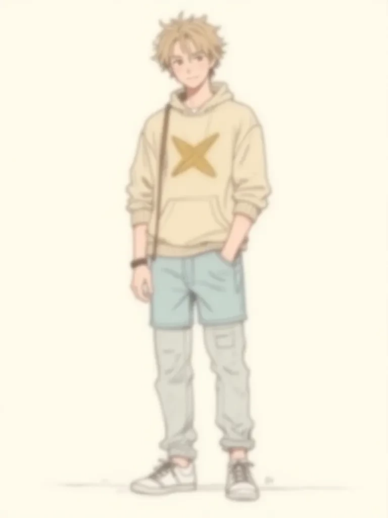 Tucker — Tucker's style is bright, comfortable, and perpetually approachable. He looks like he just stepped out of a summer catalog or off a beach. Physique: Broad-shouldered and athletic, likely from years of swimming or soccer. He’s "big-brother" tall with a posture that is relaxed and open. Features: A mess of sandy blond or light brown hair that always looks windblown. He has "smiling eyes"—the kind that crinkle at the corners—and a grin that shows off a slightly crooked front tooth. Attire: Usually seen in oversized hoodies, well-worn flannels, or vintage graphic tees. He favors light-wash denim and clean white sneakers that never stay clean for long because he’s always outside. Signature Details: A braided friendship bracelet on his wrist (that he definitely didn't make himself) and a faint dusting of freckles across his nose.