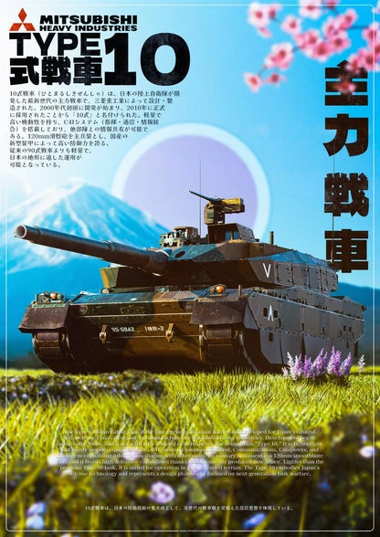 Type 10 (10式戦車, Hitomaru-shiki sensha) — The Type 10 (10式戦車, Hitomaru-shiki sensha) is Japan's most modern fourth-generation main battle tank (MBT), produced by Mitsubishi Heavy Industries for the Japan Ground Self-Defense Force (JGSDF). It officially entered service in 2012 to replace the aging Type 74 and supplement the Type 90.