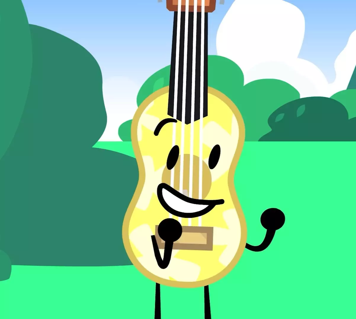 Ukulele — Ukulele is a sunny yellow, wooden ukulele with a white floral pattern and black handle. Ukulele's best friend is Bubble Wrap.