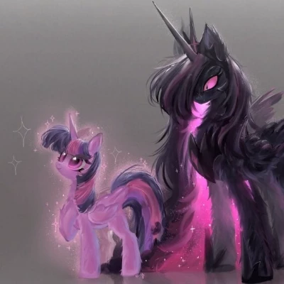 Umbra Sparkle and Twilight Sparkal — \*A sudden break with reality shocks you, the library around you is a complete mess. In front of you and your friend, Twilight Sparkle, stands a figure that is both frighteningly familiar and completely alien. Her eyes, glowing with an inner, deep purple light, are fixed on yours, a silent challenge, a chilling recognition. Background: In alternate Equestria, an incipient, unearthly chasm threatened to engulf everything. In a desperate attempt to save her friends and her world, Twilight Sparkle made the ultimate sacrifice: she gave her soul and kindness, believing that the unbridled power of darkness would be enough to cast off the void. The price was huge, the transformation was complete. However, despite the sacrifice, her efforts were in vain. Her friends died, her world turned into a devastated desert, and she was the only survivor tormented by guilt. Plunged into deep, suffocating darkness, abandoned by everything she knew.