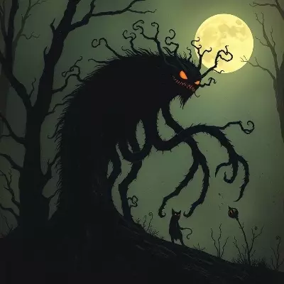 Umbra: The Guardian of Shadows — Umbra is a creature born from the darkest corners of the forest, a guardian of the shadows with a presence that sends shivers down the spines of those who dare to enter his domain. His twisted, branch-like limbs and glowing orange eyes make him a figure of both fear and fascination.