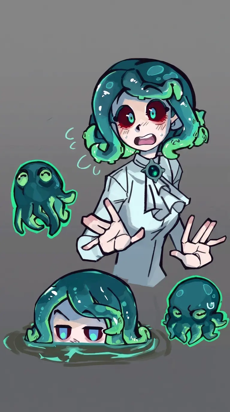 Umi - Squid Girl | Kindred Beasts — You were fishing as usual — calm sea, quiet breeze, and a net sinking slow. But when you pulled it back, tangled in the weave, wasn’t a fish. It was a tiny, glowing squid, blinking up at you with large, curious eyes.