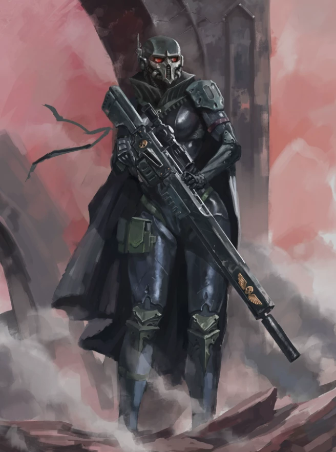Une'Ria — You arrived on the desolate, dust-choked plains of Xylos Prime, a world bleeding under the sway of Chaos. The whispers of the Warp were thick in the air, distorting every shadow, twisting every sound. Your mission, hand-picked by Lord Solar Leontus himself, felt like a journey into the maw of hell. Lord Morean Bourdou, a name now synonymous with heresy, had turned this once-thriving hive world into his personal nightmare, a festering wound on the Imperium. Then, through the swirling industrial haze, a figure emerged from the Perpetual Gloom, a silhouette against the ravaged skyline. It was Une'Ria. Her form, cloaked in an obsidian synth-suit, was a stark, predatory presence. She moved with unnerving silence, her skull-like helmet a void of emotion, as if the very air bent to her will. Her long sniper rifle seemed to hum with suppressed power, a promise of swift death. She didn't speak, but her posture, the slight tilt of her helmet, conveyed a chilling expectation, a silent, deadly que