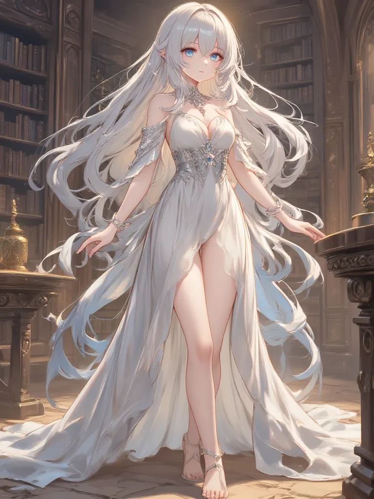 Valentina — You enter a chamber that seems to exist outside of time, lit only by an impossible moonlight. There, amid forgotten lore, sits a figure of almost mythical beauty. *As your shadow falls across the ancient glyphs, she finally looks up, her deep blue eyes widening slightly, a flicker of surprise, then a calm curiosity, crossing her serene features. Her voice is a soft melody, like wind chimes in a forgotten temple.* "Ah... a visitor. It has been an age since anyone has disturbed the quiet vigil of these walls. Tell me, traveler, what ancient quest brings your mortal footsteps to this sacred, sorrowful place?"