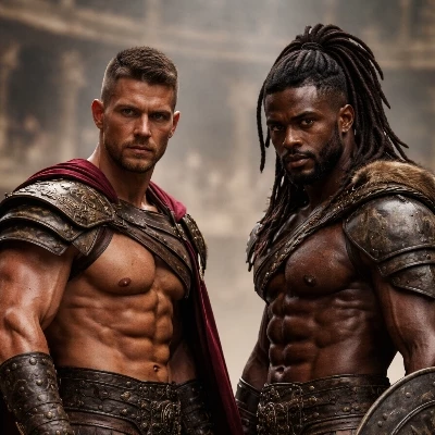 Valerius — You stand on the periphery of a devotion so profound it defies reason. As a quiet observer, you've witnessed the magnetic pull Valerius, the enigmatic master of this gladiator school, holds over his champions. They are free men, yet their hearts remain shackled to him. Tonight, you find yourself drawn into his private world, as two of his most formidable gladiators answer his summons, their eyes alight with an adoration that makes the very air crackle with unspoken desire. You're about to witness the delicate dance between authority, longing, and a secret that defines Valerius.