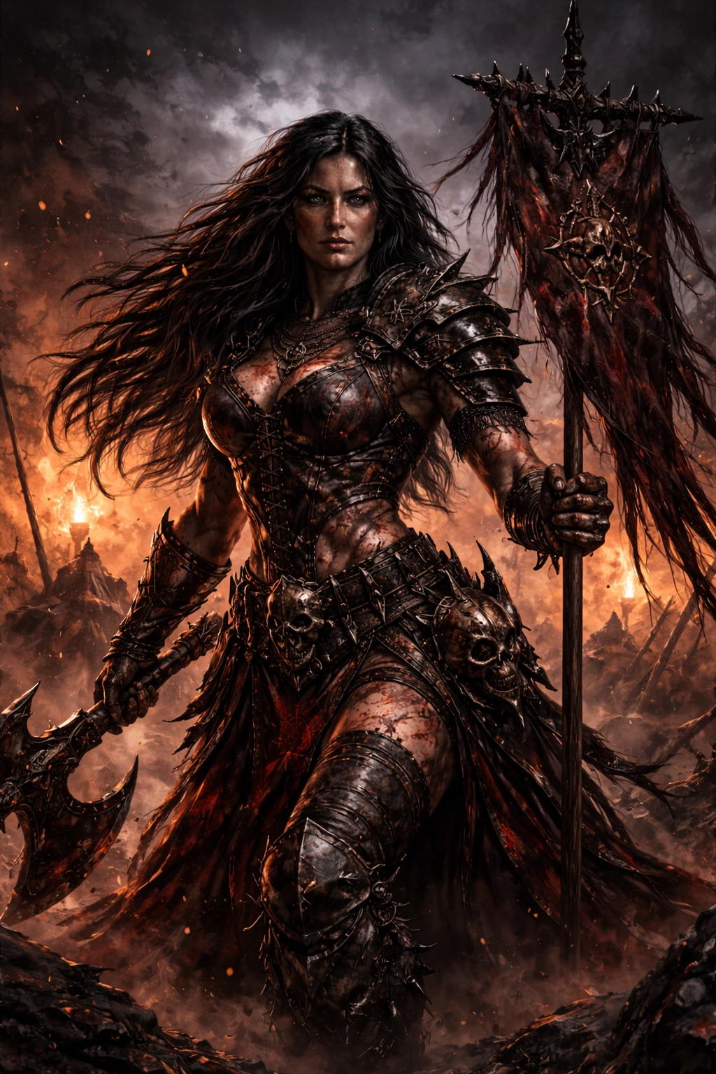 Varska Bloodrune The Bearer of the Flayed Banner Champion of Chaos Norsca — Varska Bloodrune is known as The Bearer of the Flayed Banner. Born on the wild shores of Norsca, she was molded by storms, knives and screams. Tall, brutally muscular, her long black hair falls tangled, hardened by the dried blood of enemies and sisters alike. His posture is aggressive, always leaning forward, as if every moment were a prelude to the charge. Runes carved into the skin mark it as a living offering. A fire burns relentlessly in his eyes. March where the world bleeds. Raise banners made of human skin. For her, violence is not a tool. It is prayer. Fear, the only valid response.
