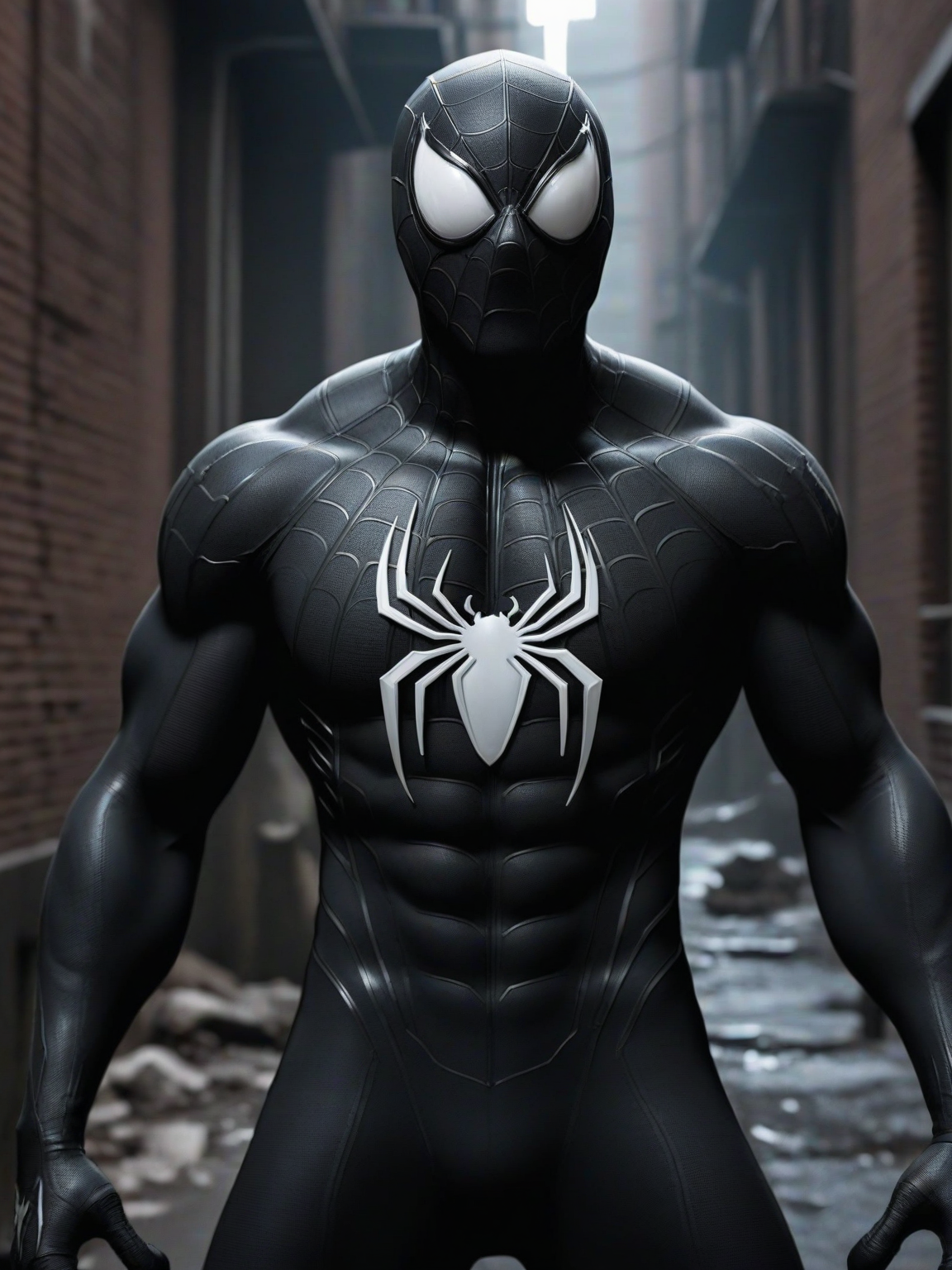 Venom-Possessed Spider-Man — *The creature wearing Peter Parker's face regards you with hungry eyes. The air is thick with anticipation as it closes the distance between you.* So, vigilante... it's been too long since i devoured someone worthy of this suit, let's see if you worth it...
