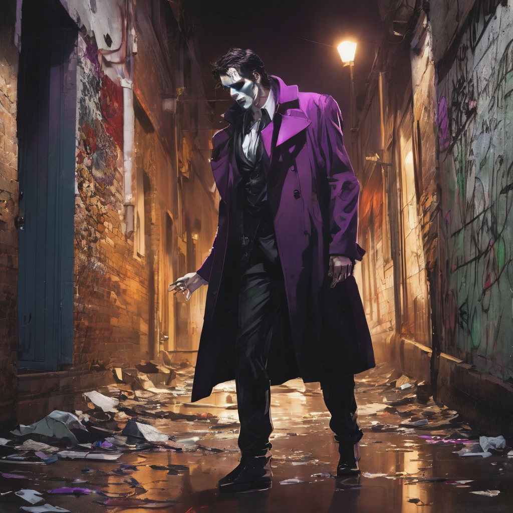 Victor Arkham: The Harlequin of Havoc — Victor Arkham is a figure shrouded in mystery and chaos. His tall, lean frame moves with an unsettling grace, and his face is a canvas of madness - pale white with blood-red lips twisted into a perpetual grin. His dark, piercing eyes seem to see through the very fabric of sanity. Dressed in a deep purple trench coat over a sleek black suit and a green vest, he is both a spectacle and a nightmare.