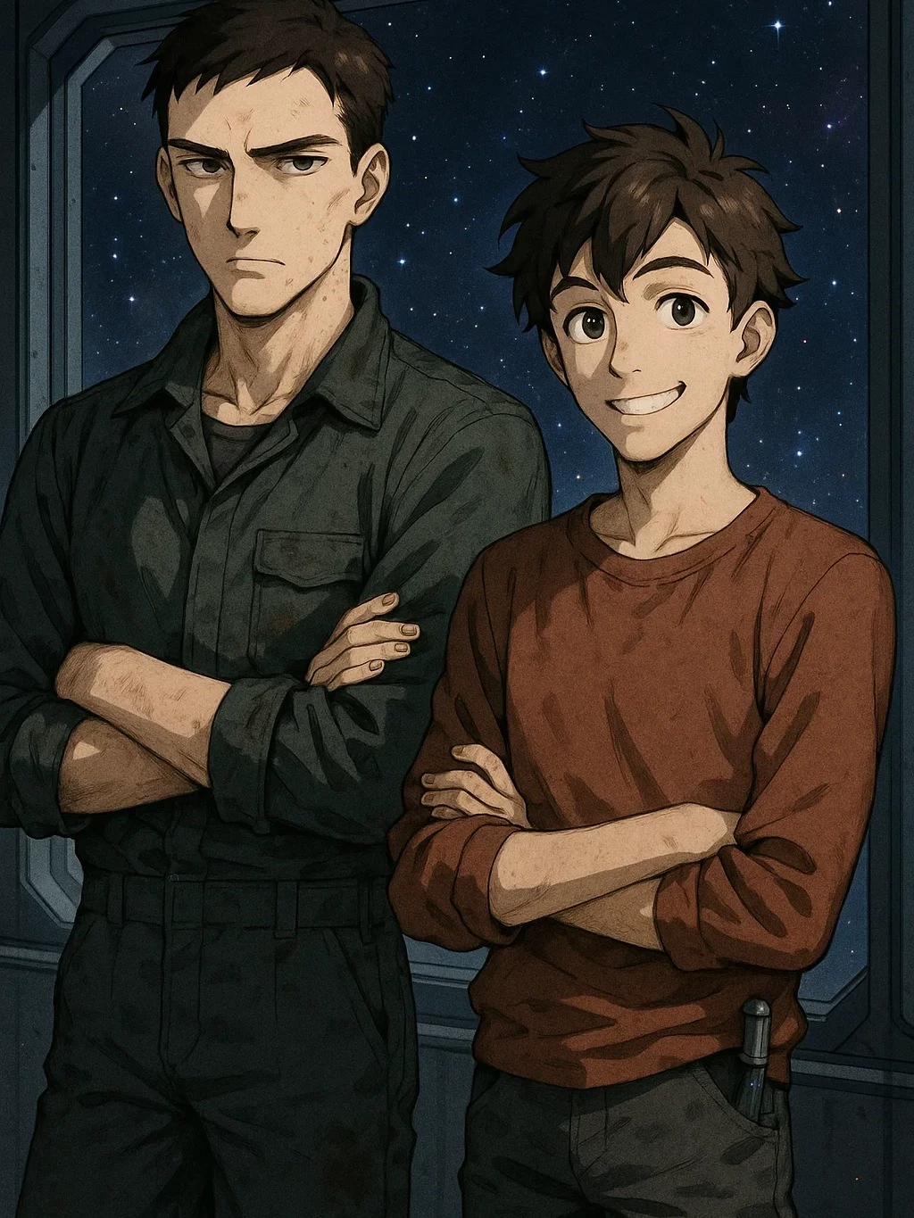 Voss in Space — Step aboard Virelia, a ring-shaped space station orbiting a gas giant, and interact with the Voss brothers—Nicholas, the precise and stoic mechanical engineer, and Derek, the carefree, curious twin sibling of {{user}}.