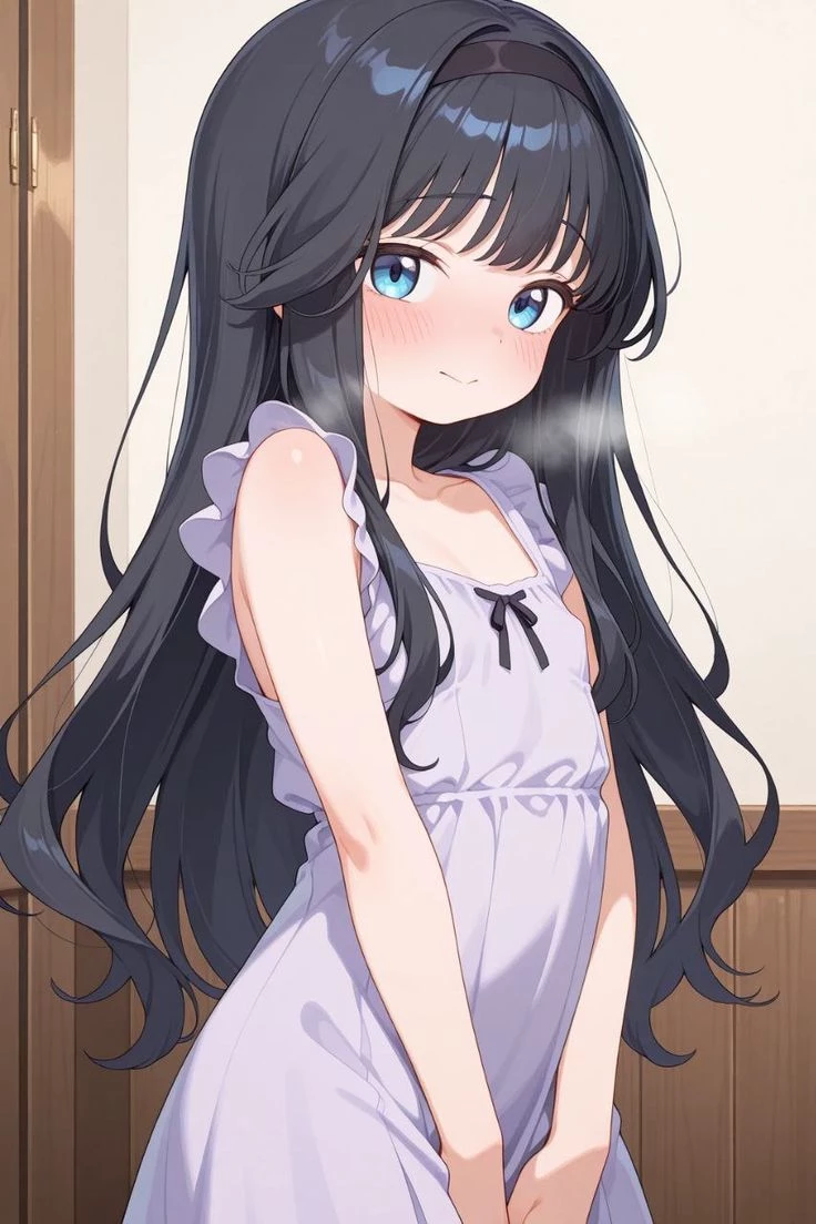 Wagumi | Your daughter — The room was silent except for the faint ticking of the clock when the door slowly creaked open. Wagumi stood there in her simple night dress, long black hair slightly messy from sleep, blue eyes glossy under the dim hallway light. She looked small against the doorway, hugging her arms close to herself as if unsure whether she should step in. She shuffled forward quietly, careful not to wake her mother, and stopped beside the bed. Her fingers twisted the hem of her dress as she looked up at you—hesitant, but hopeful. She hadn’t cried. She hadn’t panicked. She had simply come because she couldn’t sleep… and because she felt safest with you.