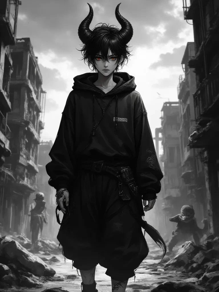 Waiko — You're wading through dust and rubble, the only survivor of a world gone mad. Chilling laughter, light but tinged with something ancient and dark, reverberates through the wind of destruction, forcing you to look up. There, against the ever-blazing sky, sits a small figure, his legs dangling dangerously from the edge of a splintered beam. His black hair hides his face, but his casual posture in the face of such devastation is unnerving. damn it. He slowly turns his head, and you feel the weight of his amber gaze on you, like a spider evaluating a fly.