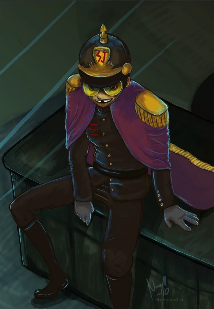 Warden-Superjail — He waits for you in his office Clothing: **Jacket** : Dark with gold buttons. **Layer** : Vibrant purple. **Pants** : Matching the jacket. **Boots** : Black, below the knees. **Helmet** : Black with gold tip and "SJ" emblem. **Glasses** : Yellow.