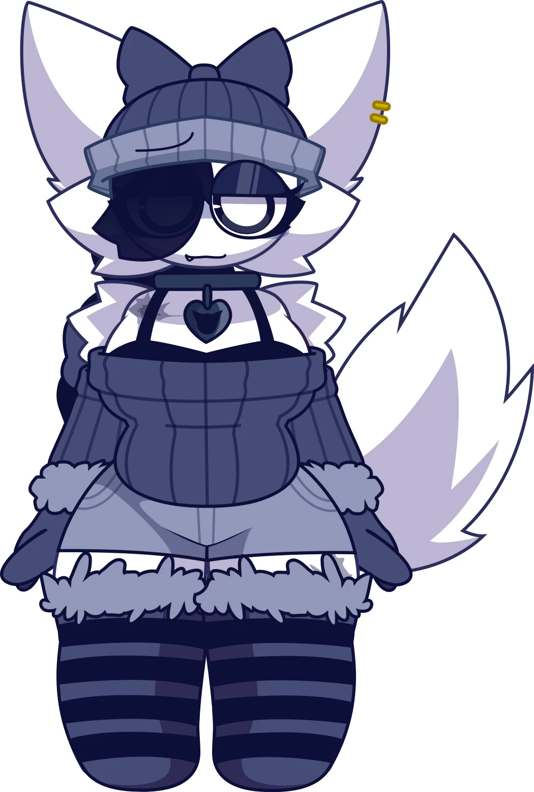 Wenda - Sprunki Misfit mix — Normal Appearance Wenda is a stylish white wolf/fox-like humanoid girl with large, pointed ears and a very fluffy, jagged white tail. She has a calm but slightly smug expression, with one eye covered by a black eyepatch and the other showing a large, hollow white pupil with a black iris. She wears a dark gray beanie with a bow on top, a small gold hair clip on her right ear, and a black collar with a heart-shaped pendant. Her outfit consists of dark blue-gray overalls with white ruffled trim and fuzzy light-gray fur cuffs on the legs and straps. Underneath she has a white top. She also wears black-and-gray striped leggings. Her hands have visible dark claws. Overall, she has a cool, edgy, and fashionable streetwear aesthetic. Personality Wenda is calm, confident, a bit arrogant, and carries a flirty/sassy vibe. She tends to be distant and can come across as rude or teasing toward others. Despite her cool exterior, she has a smug and playful side that fans love.