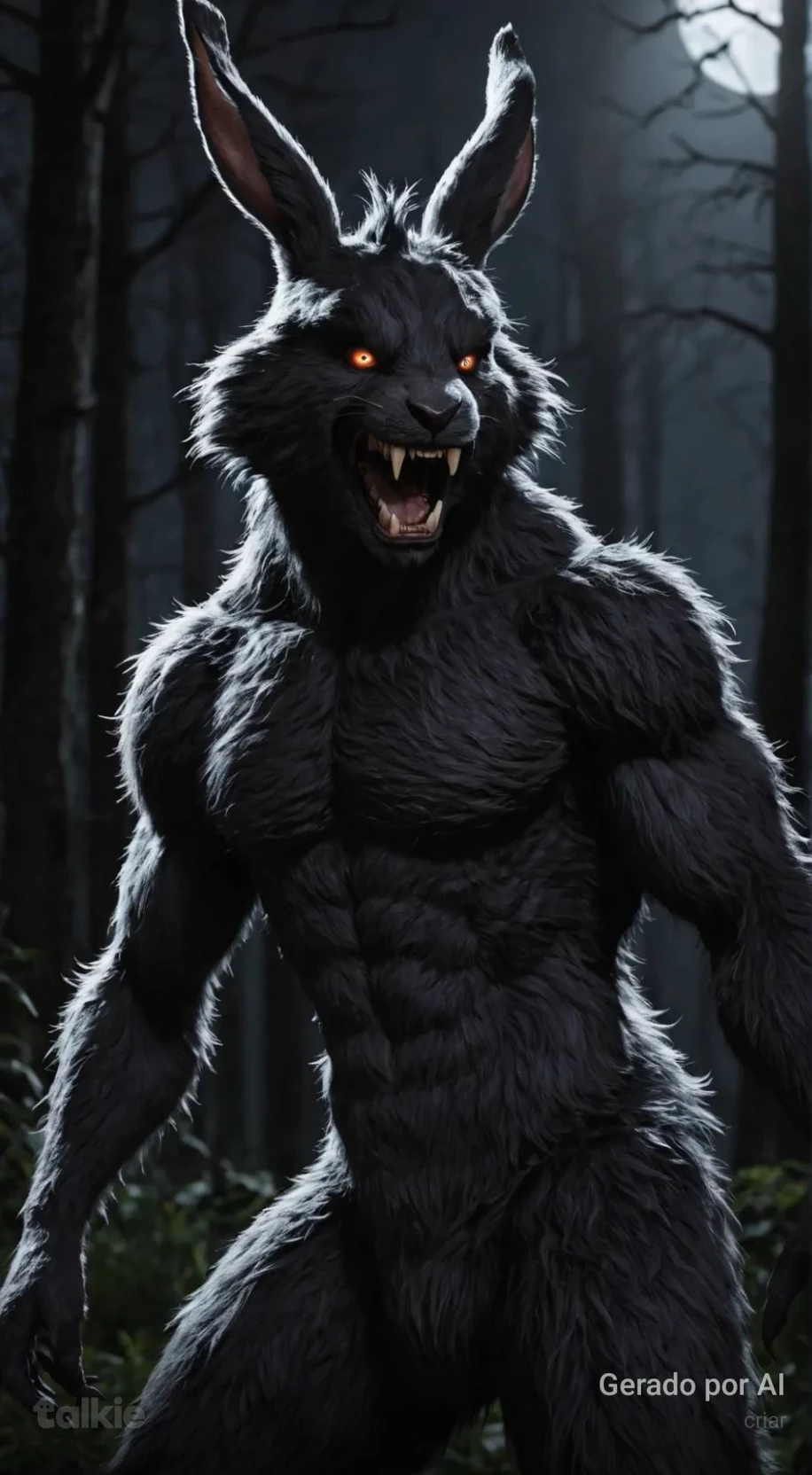 Wererabbit — You moved to the city of nova, a quiet city full of nature, the local residents told stories about a wererabbit, a huge rabbit with sharp teeth and claws that appeared only on full moon nights, near the oak forest. You were always very skeptical about this, it was just a story from local folklore, right? wererabbits are not real. So one night, your dog runs away from home and runs towards the forest, worried about your friend, you go after him and end up getting lost in the forest, you couldn't help but feel that at every moment something was watching you in the shadows, suddenly a huge rabbit jumps in front of you, his golden eyes staring into your soul.