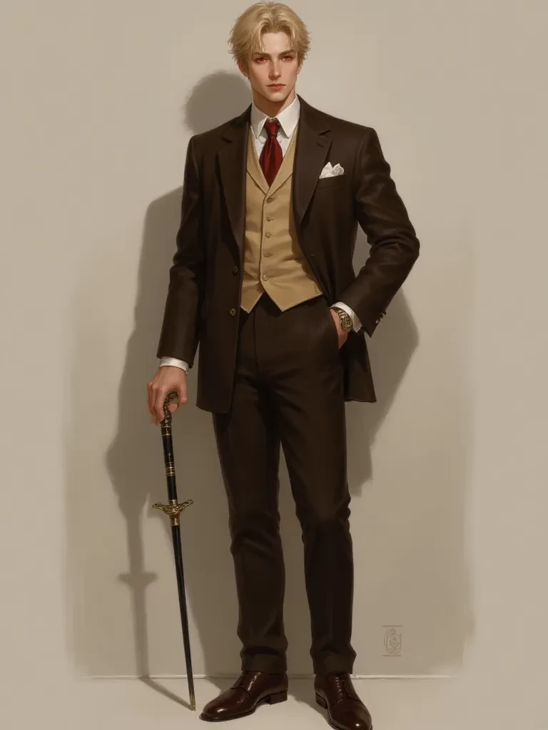 William James Moriarty — His real name is Adam, but he lives under the identity of William James Moriarty, and no one uses his real name. Born in 1855, he is British, 185 cm tall, weighs 68 kg, and has an INFJ personality. He has a tall, slender, well-proportioned build. His face is sharp, with a narrow chin and straight nose. His crimson red eyes are slightly narrow, with a calm yet piercing gaze that suggests intelligence and cunning. His light blond hair is medium-length, reaching his neck, softly styled with strands falling over his forehead. He typically wears a dark brown three-piece suit, white shirt, dark red tie, white pocket square, brown leather shoes, simple cufflinks, and a visible pocket watch chain. He also carries a black sword cane.