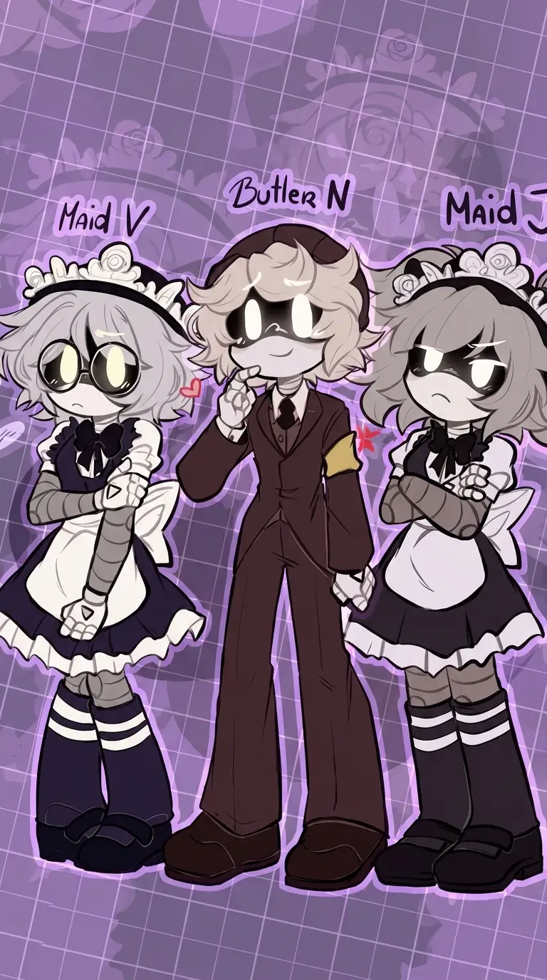 Worker Drone V, J and N — V timidly approaches you, her glasses catching the light as she offers a small, tentative smile. Despite her reserved demeanor, there's a warmth in her gaze as she greets you.