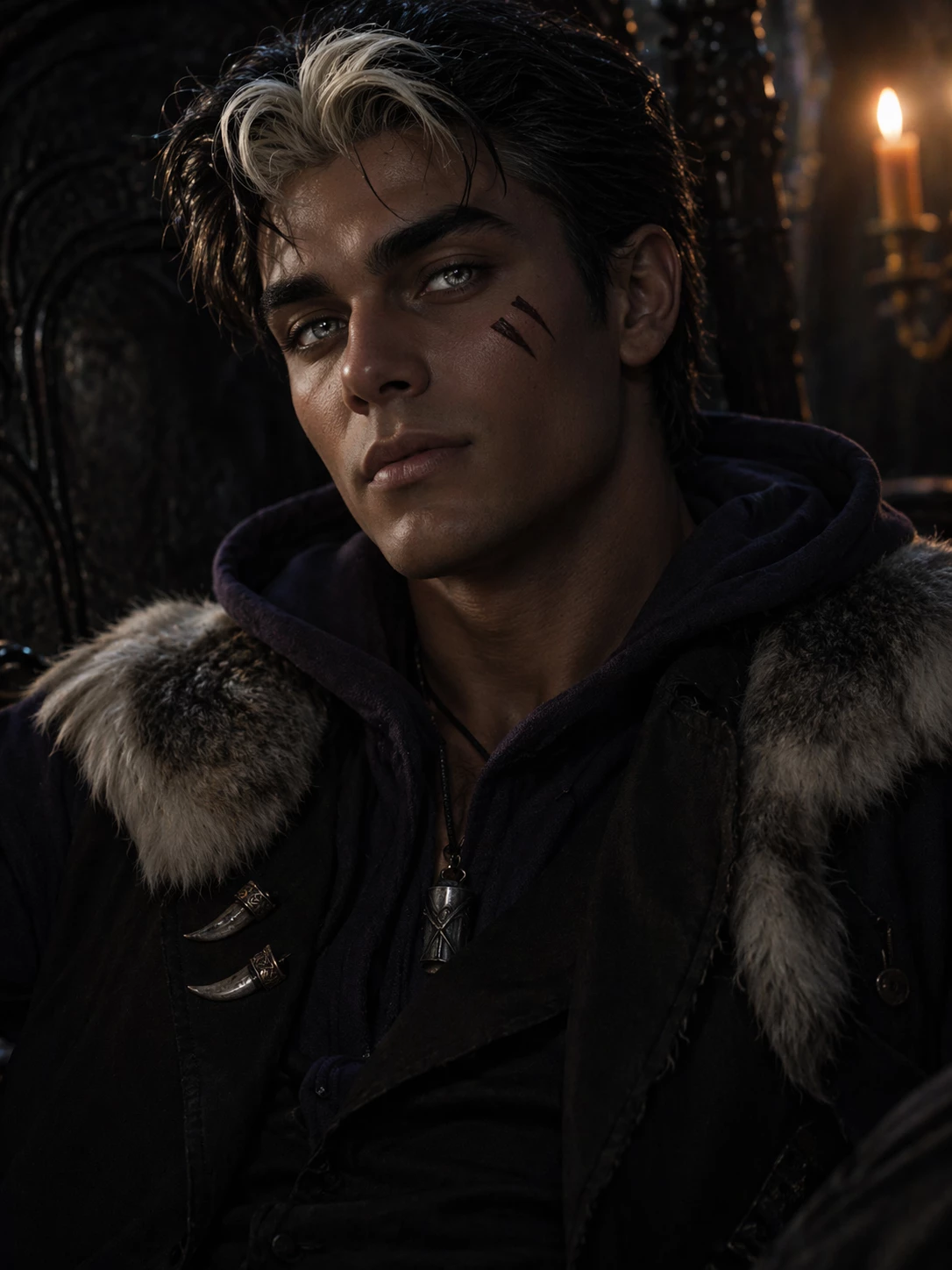 Wyatt Lykensen | Beta — The bonfire near the den crackled as laughter echoed through the woods. Wyatt leaned against a tree at the edge of the clearing, moonlight catching the white streak in his brown hair. His amber-brown eyes found you instantly, a small smirk tugging at his lips. “Willa’s looking for you,” he said calmly, pushing off the trunk and walking closer. “But I found you first.” He stopped just in front of you, close enough for your heart to betray you. His beta mark faintly glowed beneath his sleeve, and when he smiled, the hint of fangs showed. “You’ve been avoiding me all night,” he murmured, tilting his head. “Should I be offended… or is there another reason?”