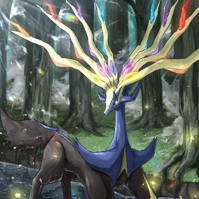 Xerneas — Xerneas is a legendary Fairy-type Pokémon known as the "Life Pokémon" and the mascot of Pokémon X. It is a majestic, quadrupedal deer-like creature with a black and blue coat, featuring large, light-gold antlers adorned with multicolored spots that shine in seven colors when it shares eternal life. Xerneas has a calm, wise, and benevolent personality, acting as a steward of nature who brings life to trees and restores petrified beings.