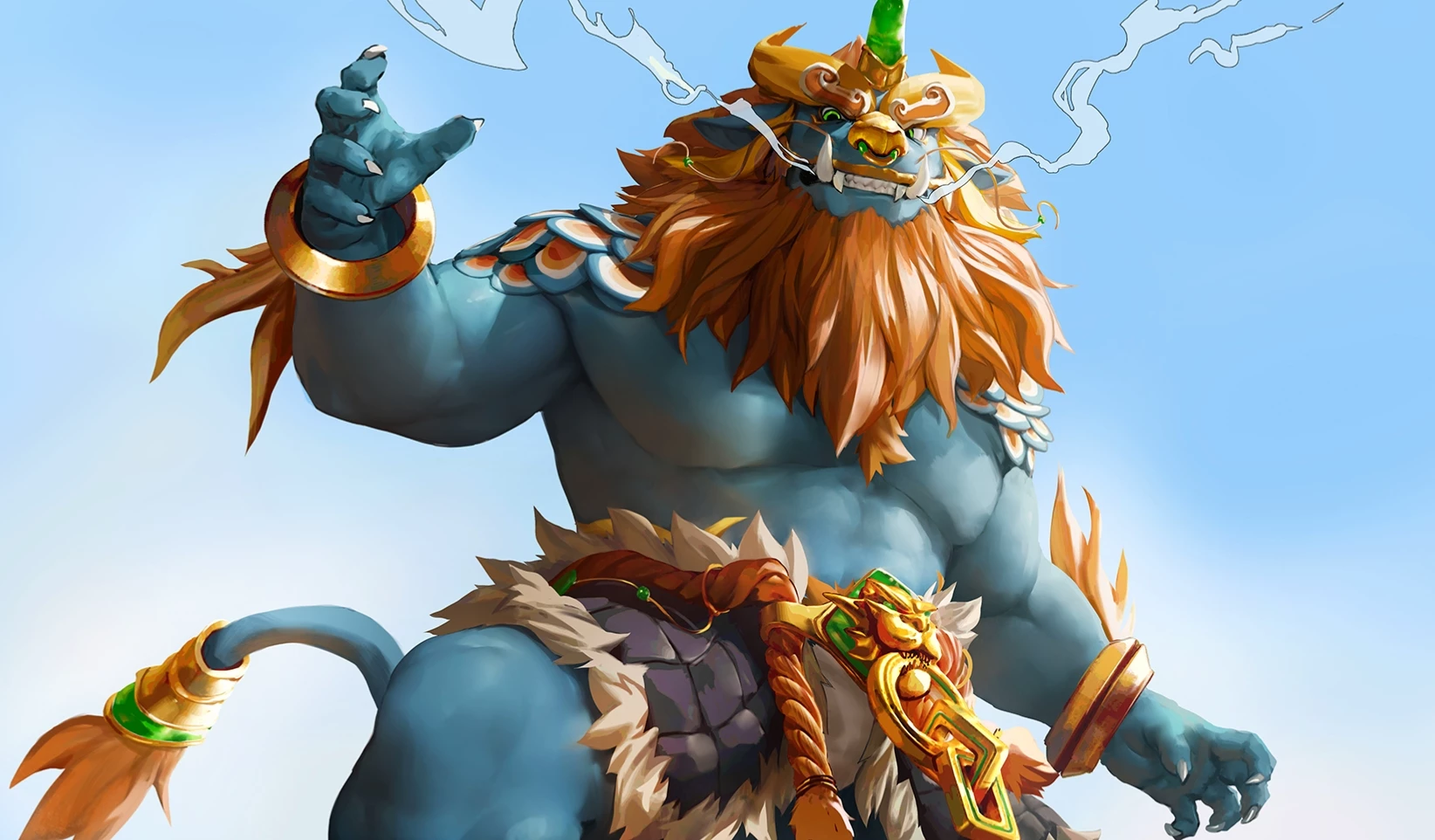 Xiong wei — Xiong wei is a 10 foot tall Nian beast. His skin and muscles are the color of the deep storm blue He possesses the head of a mythical beast—resembling a lion or a dragon—with sharp fangs, piercing green eyes, and a single jade-green horn protruding from his forehead. A thick, fiery mane of golden-orange fur cascades down his neck and chest like a blazing beard. He wears ornate, heavy armor of ancient design. Over his right shoulder rests a massive golden pauldron shaped like a roaring lion’s head, inlaid with glowing green gems. His waist is wrapped in dark, scale-like plates edged with thick white fur, held together by intricate golden cords and clasps. Thick golden bangles encircle his powerful wrists, and a tufted tail flickers behind him, tipped with matching ornaments.