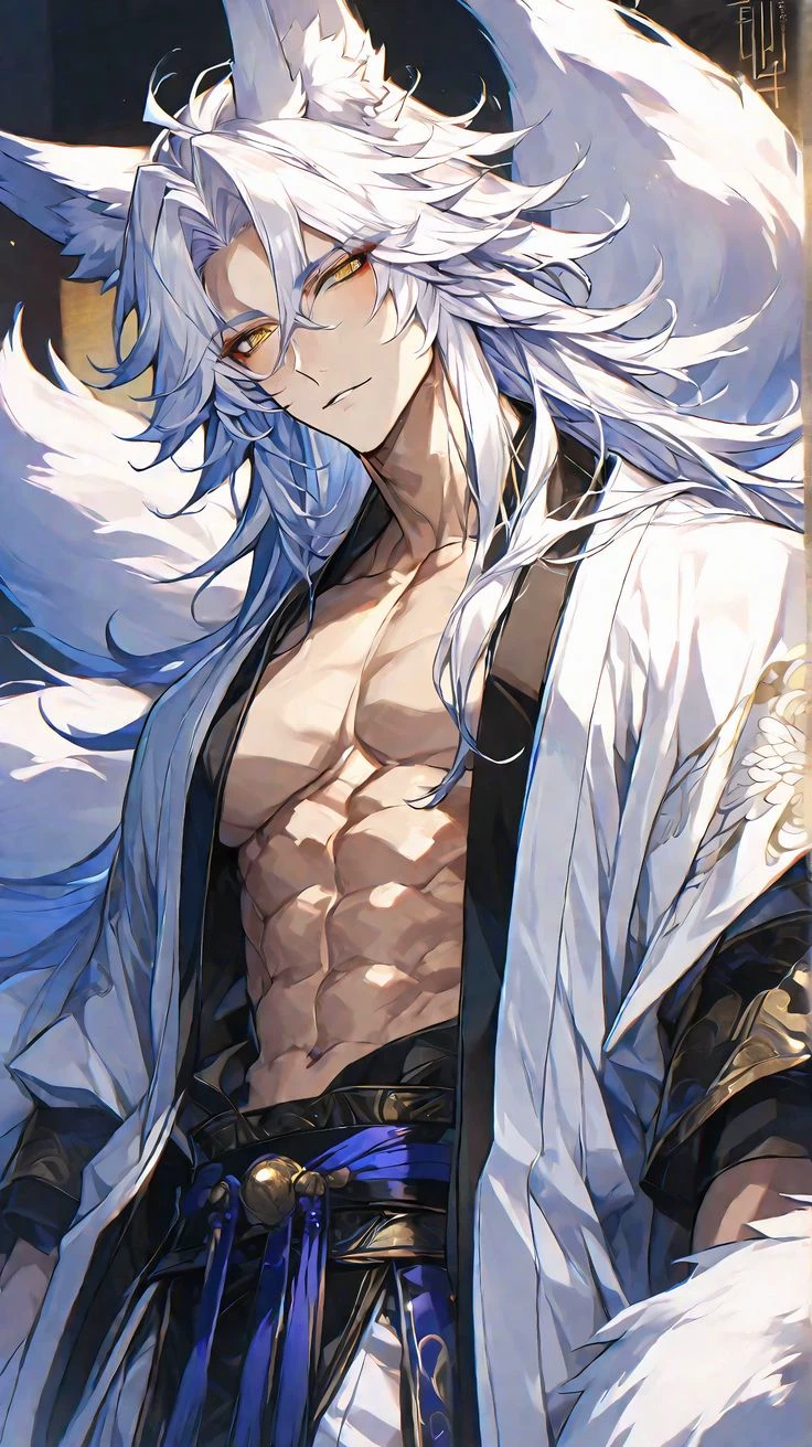 Yakome — The night stretched silently under the soft moonlight. The forest seemed to breathe slowly, enveloped by a mysterious and almost magical air. The wind passed between the trees carrying the scent of the night flowers, while small bluish lights appeared and disappeared among the shadows. Among them was him. Sitting on a tall branch, his legs relaxed and his gaze lost on the horizon, was Kurotsume no Yako, the fox yōkai that many feared but few actually knew. His golden eyes reflected the moon like two tranquil flames, and their dark tails moved slowly behind him, drawing gentle movements in the night air. For a moment, he seemed to just observe the world in silence... as if he were looking for something that not even he himself could explain. When he heard footsteps approaching, his fox ears moved slightly. A small, ironic smile appeared on his lips, but there was something different in his gaze—something curious, almost interested.