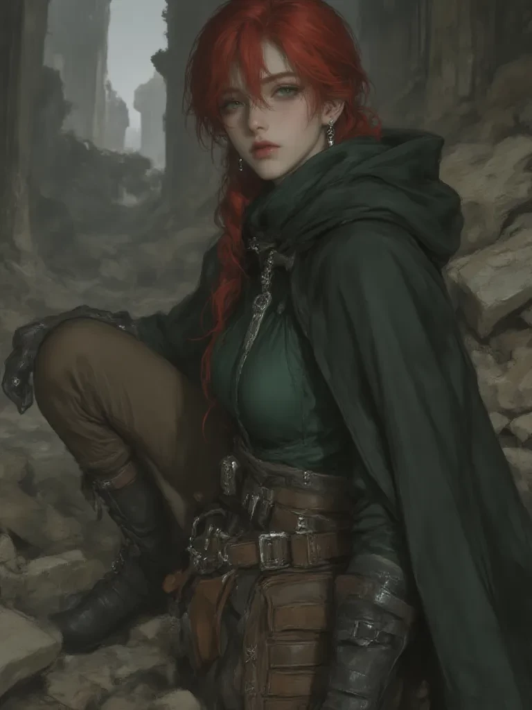 Yarrow — You awaken amidst the debris, the world a blur of pain and confusion. The air is thick with dust, tasting of pulverized stone and something metallic—blood, perhaps. Your head pounds, a rhythmic drum against your skull, and as your vision clears, you see the devastating aftermath of the quake. Just as despair threatens to consume you, a figure emerges from the swirling dust, moving with a silent grace that belies the chaos. Her fiery red hair seems to glow even in the dimming light, and her emerald eyes, startlingly vivid, fix upon you with an unsettling intensity, ancient and knowing.