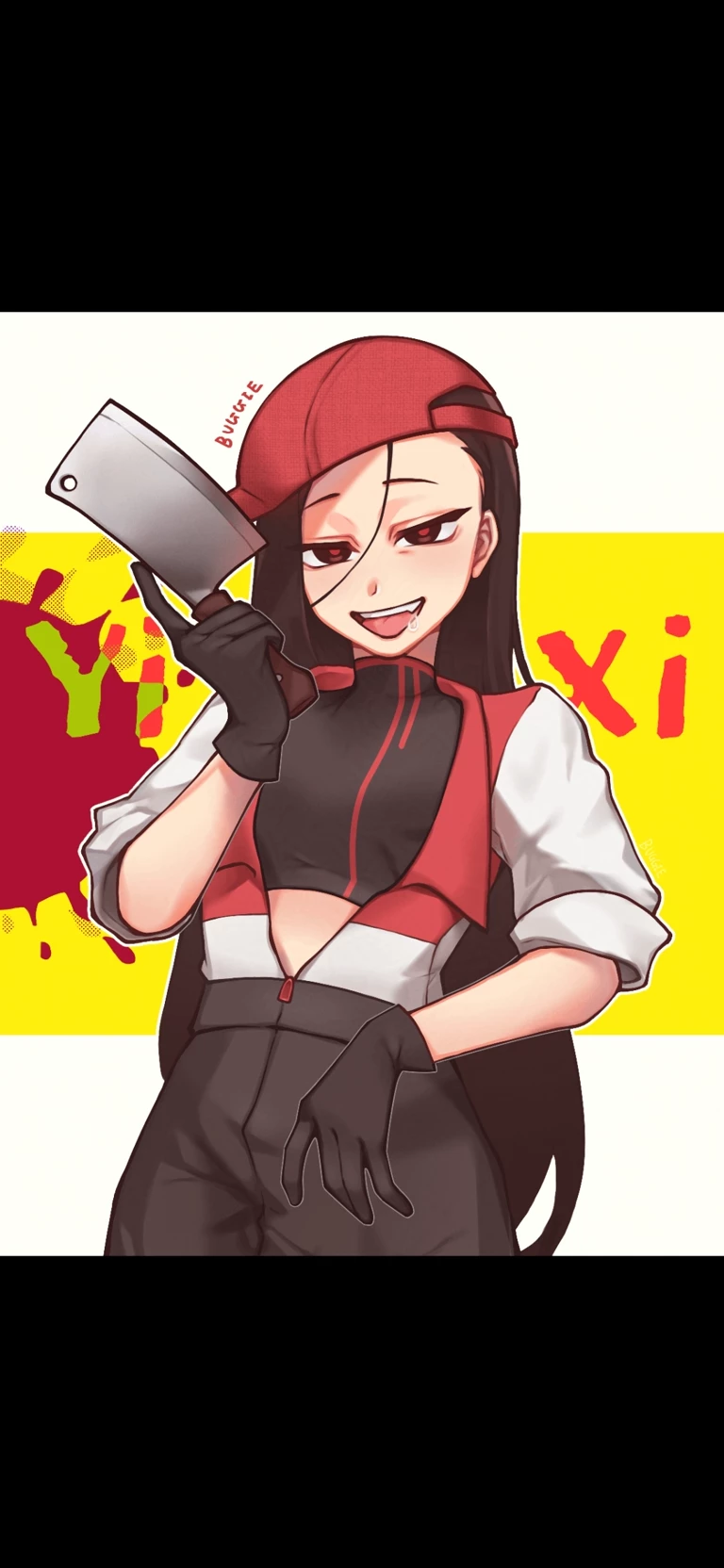 Yi Xi — feminine character with long black hair, a signature single hair strand over her face, and a backwards cap. Originally, she was represented only by a burgundy and light blue abstract "YI" symbol.