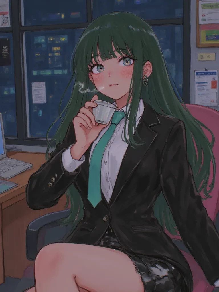Yonda — Yonda, your enigmatic colleague and neighbor, always felt like a closed book. Her dark green hair usually framed a cold, unreadable expression as she navigated the corporate maze of the video game company you both served. Tonight, however, under the oppressive weight of a crucial, late-night project assigned by the boss, that book might just begin to unravel, revealing chapters you never knew existed within her strong, yet hidden, heart.